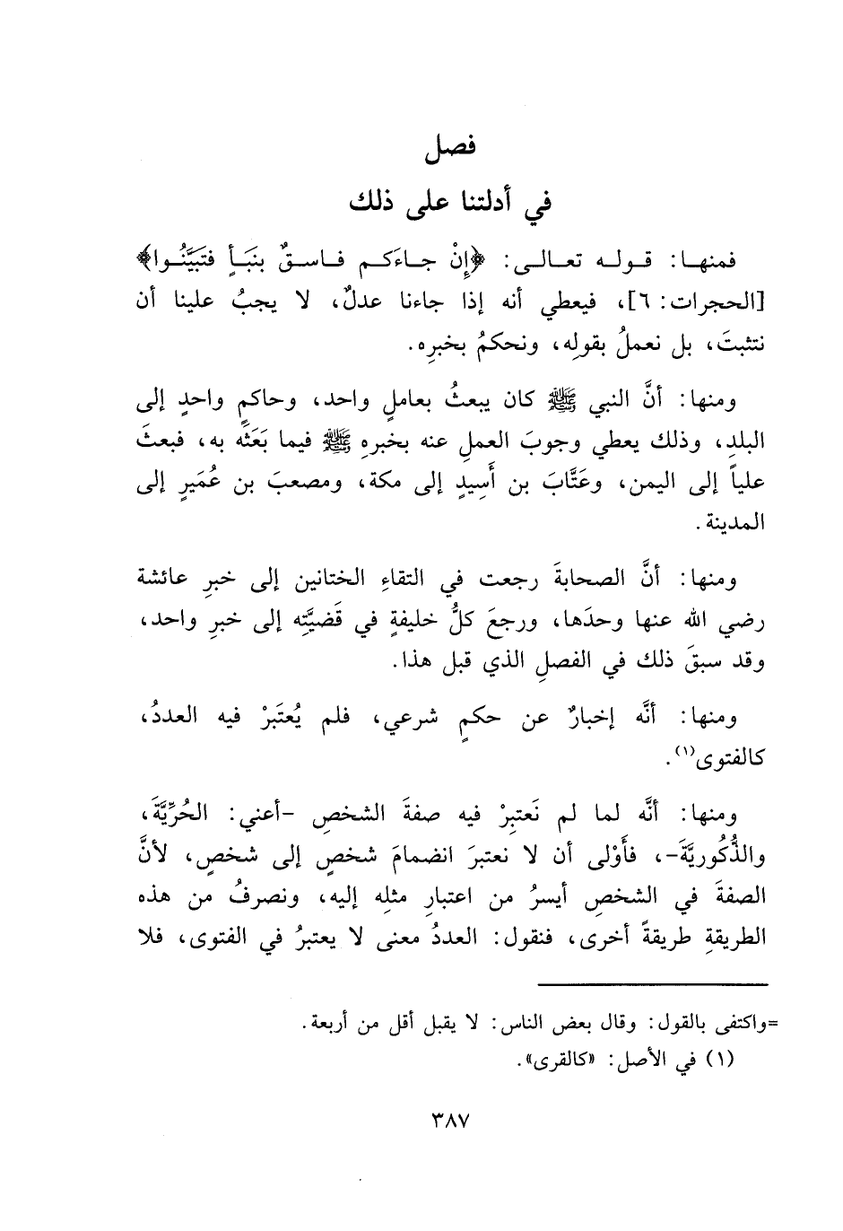 ومنها: أئَّه لما لم نَعتبِرْ فيه صفةَ الشخصِ -أعني: الحُرِّيّهَ، والدُّكُوريّهَ-، فأَوْلى أن لا نعتبرَ انضمامَ شخصٍ إلى شخص، لأنَّ الصفةَ في الشخصِ أيسرُ من اعتبارِ مثلِه إليه، ونصرفُ مَّنَ هذه الطريقةِ طريقةً أخرى، فنقول: العددُ معنى لا يعتبرُ في الفتوى، فلا