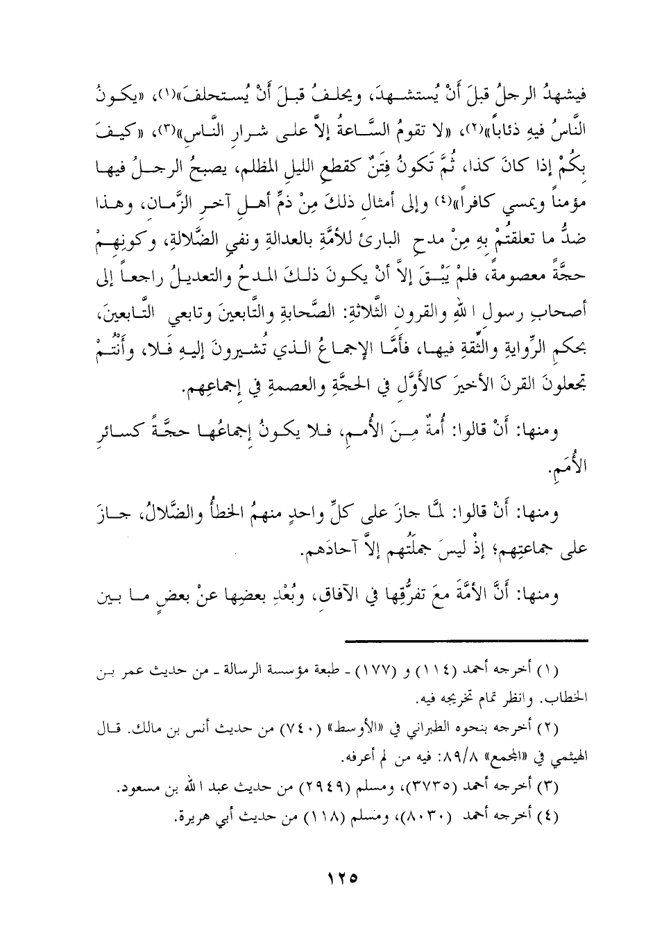 فيشهدُ الرجلُ قبلَ أَنْ يُستشهدَ، ويحلف قبلَ أَنْ يُستحلف" (١)، "يكون النّاس فيهِ ذئاباً" (٢)، "لا تقومُ السَّاعة إلا على شرارِ النَّاسِ" (٣)، "كيفَ بِكمْ إذا كانَ كذا، ثمَّ تَكونُ فِتَنٌ كقطع الليلِ المظلم، يصبحُ الرجلُ فيها مؤمناً ويمسي كافراً" (٤) وإلى أمثالِ ذلكَ مِنْ ذمِّ أهلِ آخرِ الزَّمانِ، وهذا ضدُّ ما تعلقتُمْ بِهِ مِنْ مدح البارئ للأمَّةِ بالعدالةِ ونفى الضَّلالةِ، وكونِهِم حجَّةً معصومةَ، فلمْ يَبْقَ إلاَّ أنْ يكونَ ذلكَ المدحُ وُالتعديل راجعاً إلى أصحابِ رسولِ اللهِ والقرون الثَّلاثةِ: الصَّحابةِ والتَّابعينَ وتابعي التابعينَ، بحكمِ الرِّوايةِ والثِّقةِ فيها، فأَمًّا الإجماعُ الذي تُشيرونَ إليهِ فَلا، وأَنْتم تجعلونَ القرنَ الأخيرَ كالأَوَّلِ في الحجَّةِ والعصمةِ في إِجماعِهم.