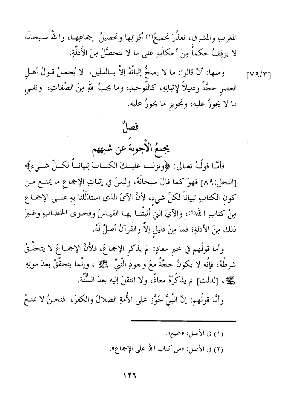 فأمَّا قولُهُ تعالى: {وَنَزَّلْنَا عَلَيْكَ الْكِتَابَ تِبْيَانًا لِكُلِّ شَيْءٍ} [النحل: ٨٩] فهوَ كما قالَ سبحانَهُ، وليسَ في إثباتِ الاجماع ما يمنع من كونِ الكتابِ تبياناً لكلِّ شيءٍ، لأنَّ الاَيَ الذي استدْلَلْنا بِهِ على الإجماع مِنْ كتابِ الله (٢)، والاَيَ التي أثبتْنا بها القياسَ وفحوى الخطابِ وغيرَ ذلكَ مِنَ الأدلةِ؛ فما مِنْ دليلٍ إلا والقرآنُ أصلٌ لَهُ.