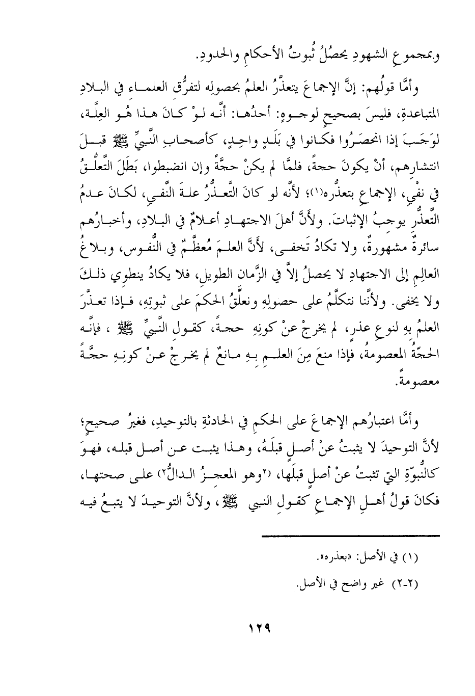 وأمَّا اعتبارُهم الإجماع على الحكمِ في الحادثةِ بالتوحيدِ، فغير صحيحٍ؛ لأنَّ التوحيدَ لا يثبت عنْ أصلٍ قبلَهُ، وهذا يثبت عن أصل قبله، فهوَ كالنُّبوّةِ التي تثبتُ عنْ أصلٍ قبلَها، (٢ وهو المعجزُ الدالُّ ٢) على صحتها، فكانَ قولُ أهلِ الإجماع كقولِ النبي- صلى الله عليه وسلم - ولأنَّ التوحيدَ لا يتبعُ فيه