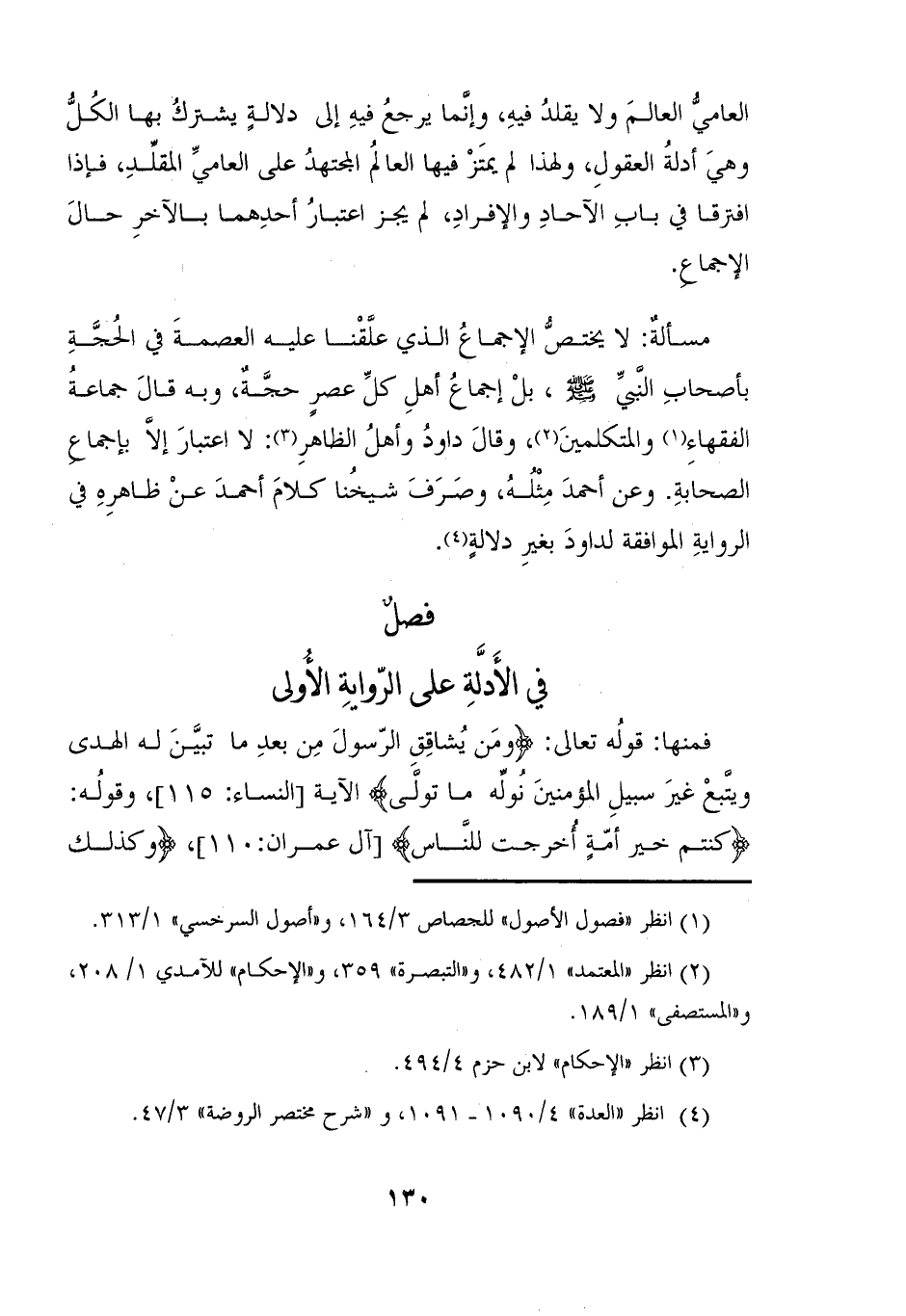 مسألة: لا يختصّ الإجماعُ الذي علَّقْنا عليه العصمةَ في الحُجَّةِ بأصحابِ النبيِّ - صلى الله عليه وسلم -، بلْ إجماعُ أهلِ كلِّ عصرٍ حجَّة، وبه قالَ جماعة الفقهاءِ (١) والمتكلمينَ (٢)، وقالَ داودُ وأهلُ الظاهرِ (٣): لا اعتبارَ إلا بإجماع الصحابةِ. وعن أحمدَ مِثْلُهُ، وصَرَفَ شيخُنا كلامَ أحمدَ عنْ ظاهرِهِ في الروايةِ الموافقة لداودَ بغيرِ دلالةٍ (٤).