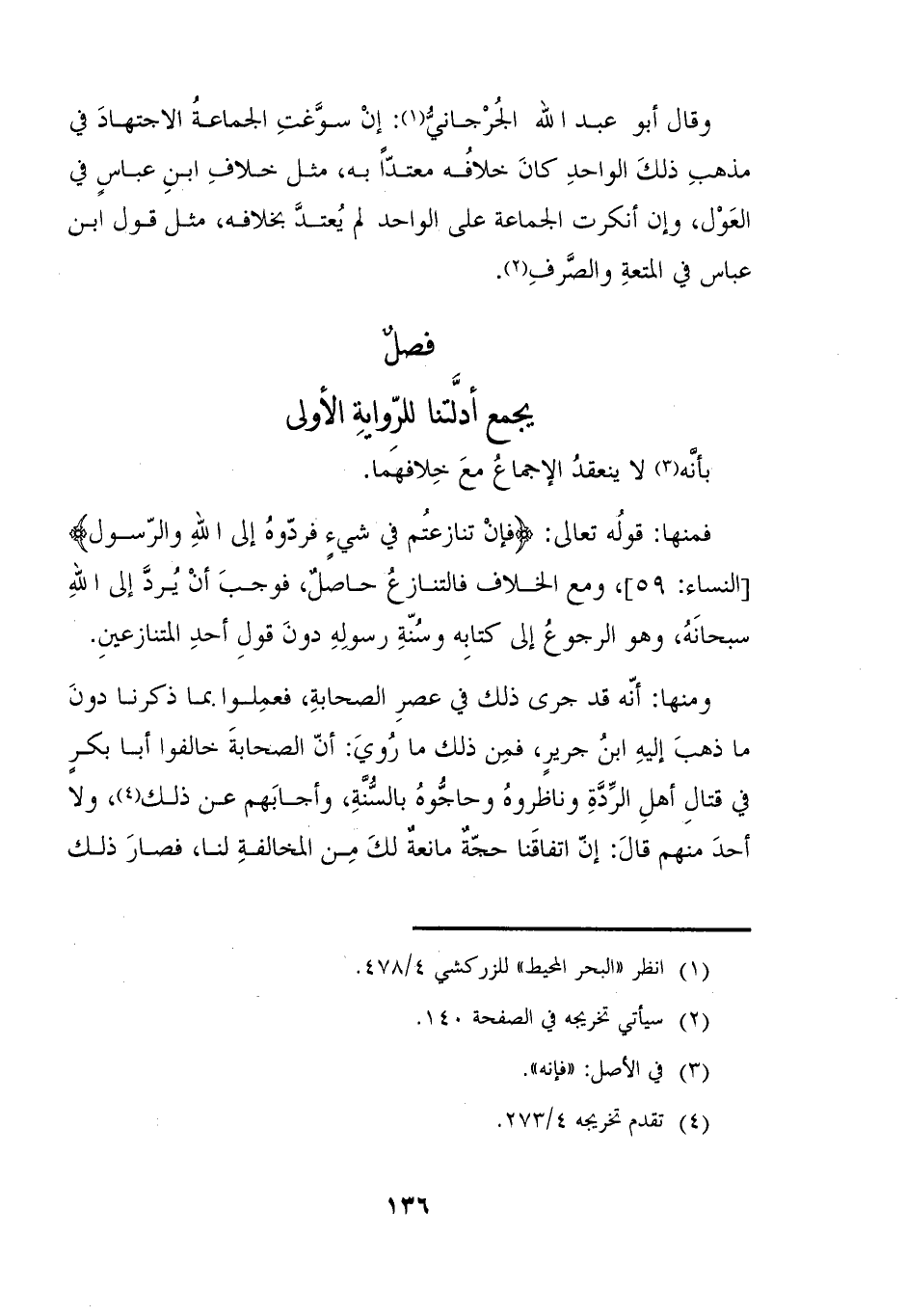 وقال أبو عبد الله الجُرْجانيُّ (١): إنْ سوَّغتِ الجماعةُ الاجتهادَ في مذهبِ ذلكَ الواحدِ كانَ خلافُه معتدّاً به، مثل خلافِ ابنِ عباسٍ في العَوْل، وإن أنكرت الجماعة على الواحد لم يُعتدَّ بخلافه، مثل قول ابن عباس في المتعةِ والصَّرفِ (٢).