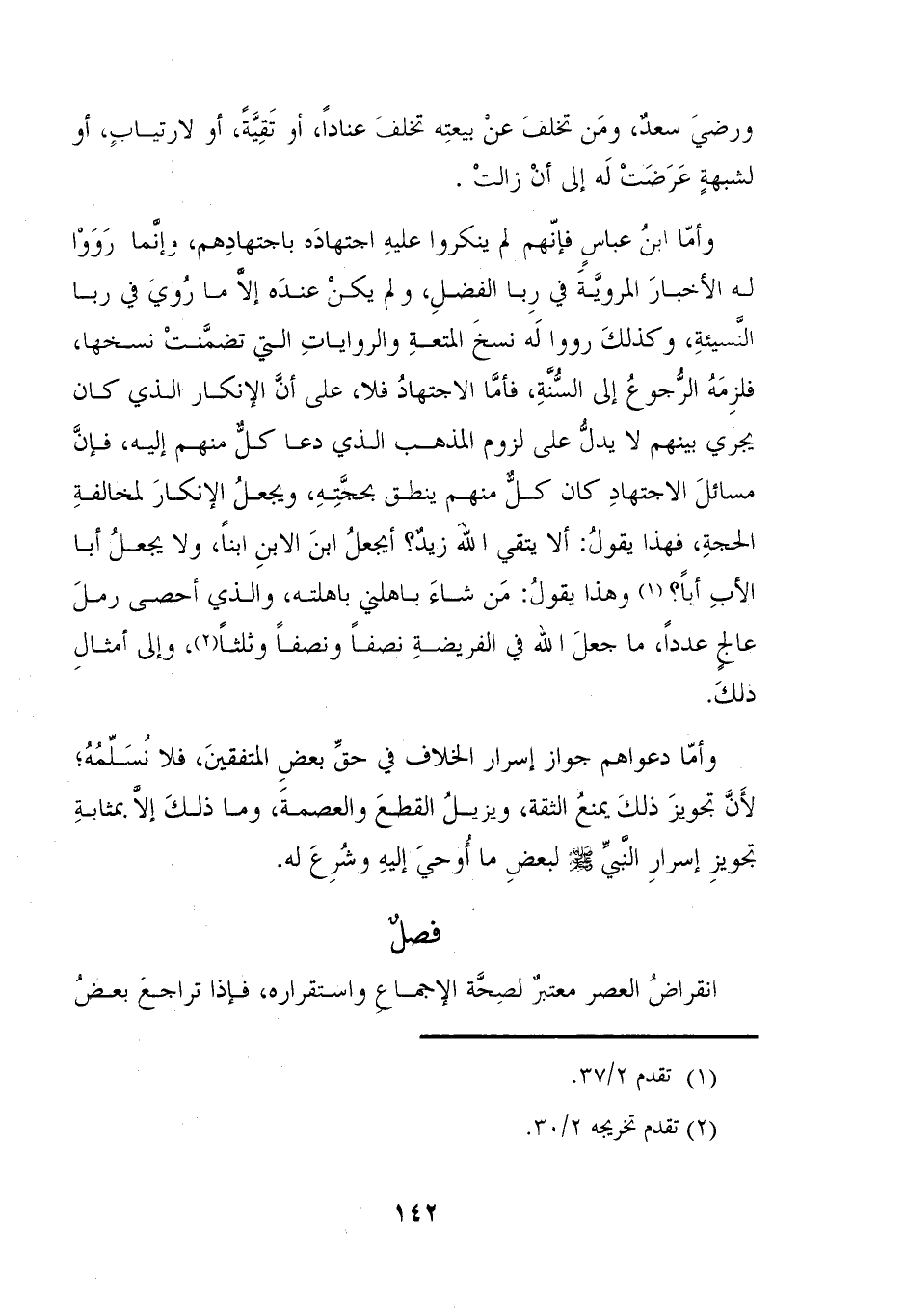 وأمّا ابنُ عباسٍ فإنّهم لم ينكروا عليهِ اجتهادَه باجتهادِهم، وإنما رَوَوْا له الأخبارَ المرويَّةَ في رِبا الفضلِ، ولم يكن عندَه إلا ما رُويَ في ربا النَّسيئةِ، وكذلكَ رووا لَه نسخَ المتعةِ والرواياتِ التي تضمَّنتْ نسخها، فلزِمَهُ الرُّجوعُ إلى السُّنةِ، فأمَّا الاجتهادُ فلا، على أنَّ الإنكار الذي كان يجري بينهم لا يدلُّ على لزوم المذهب الذي دعا كلٌّ منهم إليه، فإنَّ مسائلَ الاجتهادِ كان كلٌّ منهم ينطق بحجَّتِهِ، ويجعلُ الإنكارَ لمخالفةِ الحجةِ، فهذا يقولُ: ألا يتقي الله زيدٌ؟ ايجعلُ ابنَ الابنِ ابناً، ولا يجعلُ أبا الأبِ أباً؟ (١) وهذا يقولُ: مَن شاءَ باهلني باهلته، والذي أحصى رملَ عالجٍ عدداً، ما جعلَ الله في الفريضةِ نصفاً ونصفاً وثلثاً (٢)، وإلى أمثالِ ذلكَ.