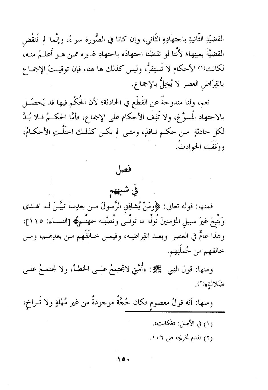 القضيّةِ الثّانيةِ باجتهادِهِ الثّاني، وإن كانا في الصُّورة سواءً، وإنَّما لم نَنقضِ القضيَّة بعينها، لاننا لو نقضْنا اجتهادَه باجتهادِ غيره ممن هو أَعلم منه، لكانت (١) الأحكام لا تَستِقرُّ، وليس كذلك ها هنا، فإن توقيتَ الاجماع بانقِرَاضِ العصر لا يُخِلُّ بالإجماع.