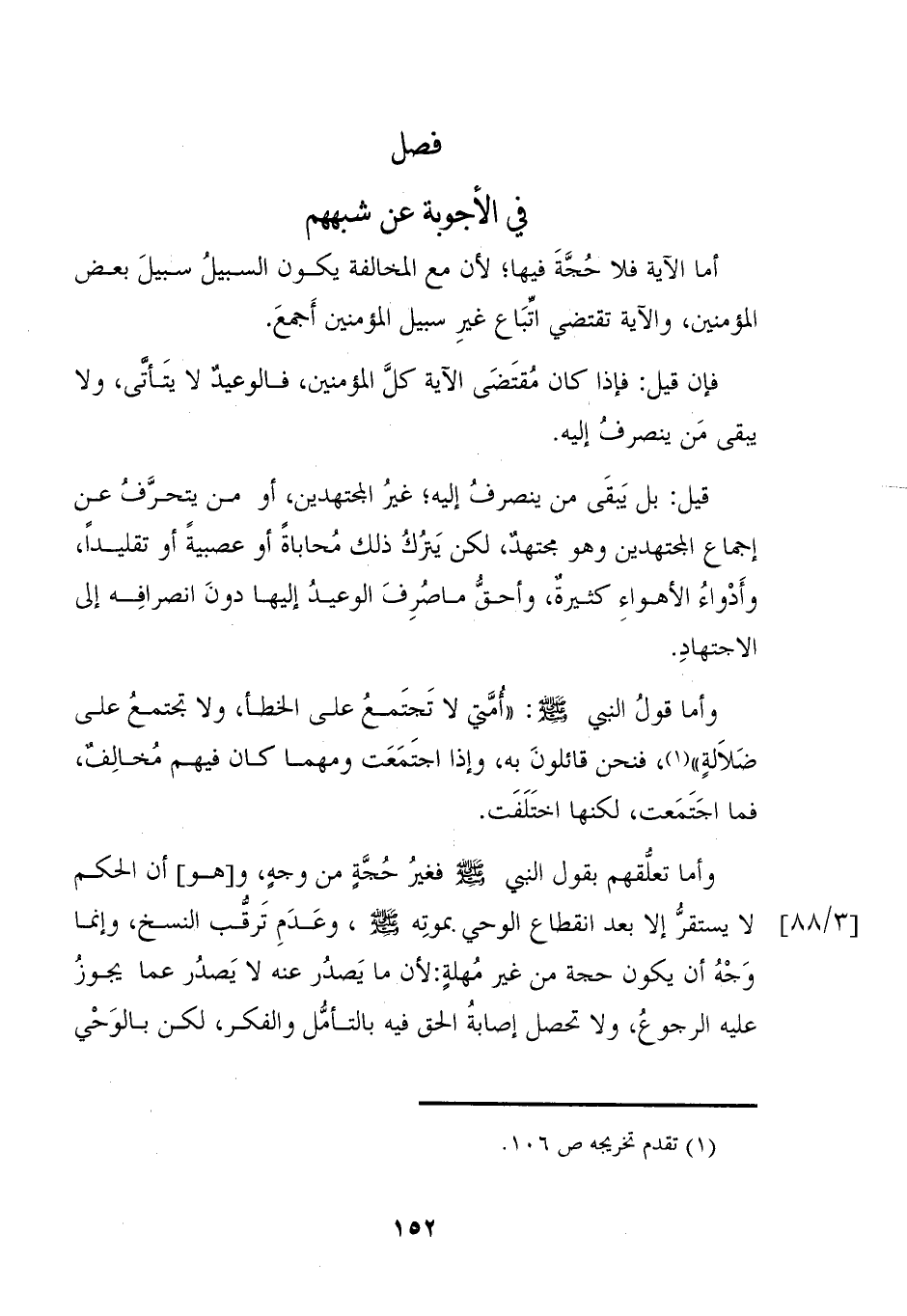 وأما قولُ النبي - صلى الله عليه وسلم -:"امَّتي لا تَجتَمعُ على الخطأ، ولا تجتمعُ على ضَلاَلةٍ" (١)، فنحن قائلونَ به، وإذا اجتَمَعَت ومهما كان فيهم مُخالِف، فما اجَتَمَعت، لكنها اختَلَفَت.