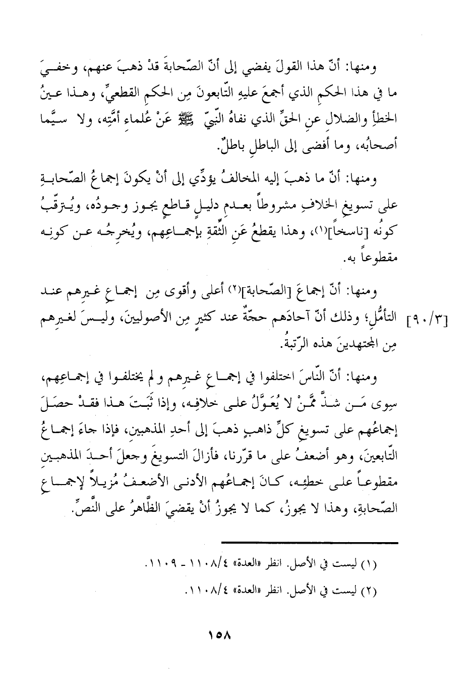 ومنها: أن النّاسَ اختلفوا في إجماع غيرِهم ولم يختلفوا في إجماعِهم، سِوى مَن شذَّ ممَّنْ لا يُعَوَّلُ على خلافِه، وإذا ثَبَتَ هذا فقدْ حصَلَ إجماعُهم على تسويغ كلِّ ذاهبٍ ذهبَ إلى أحدِ المذهبينِ، فإذا جاءَ إجماعُ التّابعينَ، وهو أضعفُ على ما قرّرنا، فأزالَ التسويغَ وجعلَ أحدَ المذهبينِ مقطوعاً على خطئِه، كانَ إجماعُهم الأدنى الأضعفُ مُزيلاً لإجماع الصّحابةِ، وهذا لا يجوزُ، كما لا يجوزُ أنْ يقضيَ الظاهرُ على النصِّ.