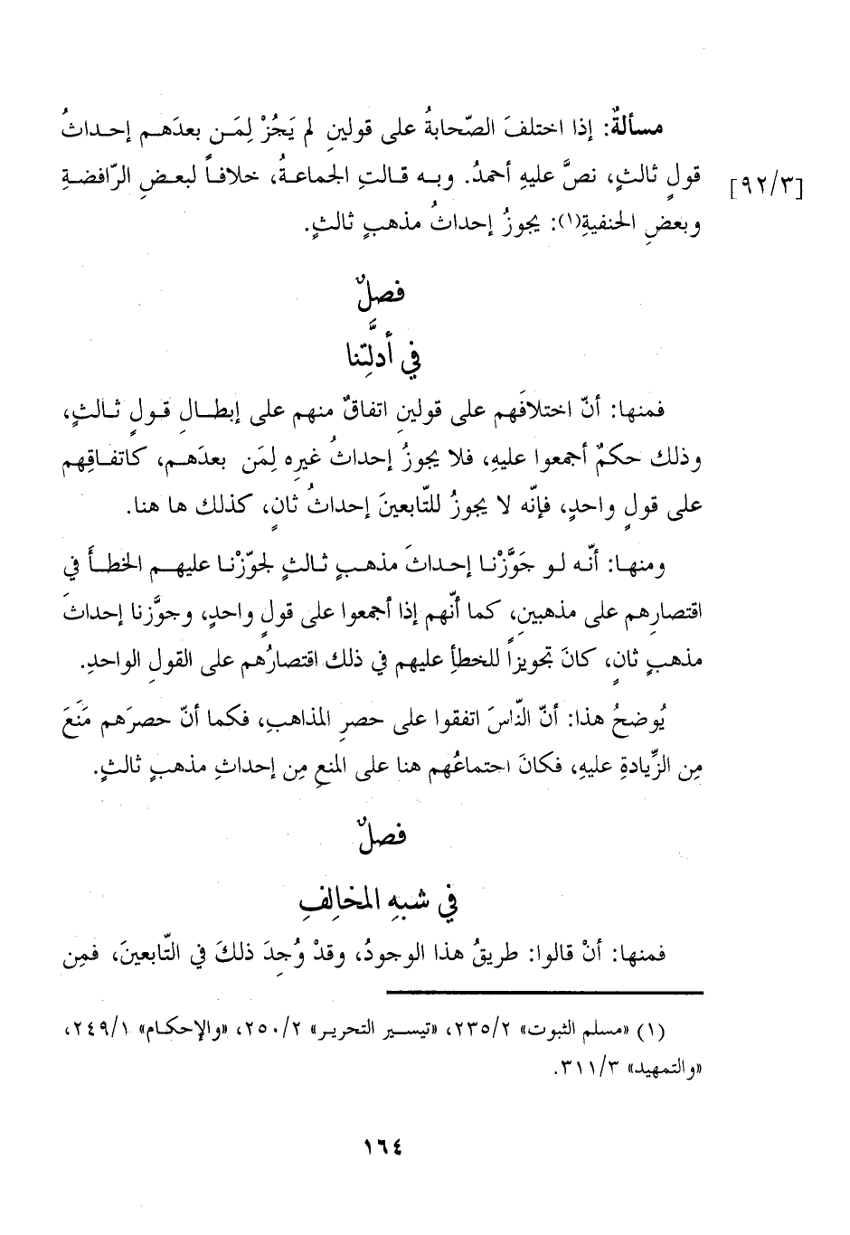 مسألةٌ: إذا اختلف الصّحابةُ على قولينِ لم يَجُز لِمَن بعدَهم إحداثُ قولٍ ثالثٍ، نصَّ عليهِ أحمدُ. وبه قالتِ الجماعةُ، خلافاً لبعضِ الرّافضةِ وبعض الحنفيةِ (١): يجوزُ إحداثُ مذهبٍ ثالثٍ.