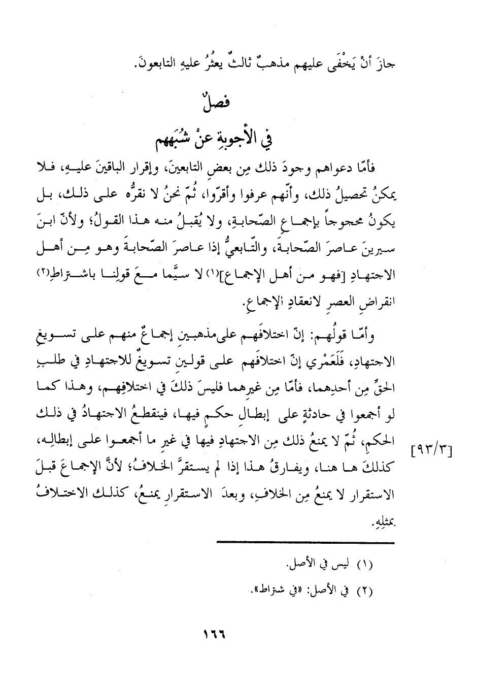 فأمّا دعواهم وجودَ ذلك مِن بعضِ التابعينَ، وإقرار الباقينَ عليهِ، فلا يمكنُ تحصيلُ ذلك، وأنّهم عرفوا وأقرّوا، ثمّ نحنُ لا نقرُّه على ذلك، بل يكونُ محجوجاً بإجماع الصّحابةِ، ولا يُقبلُ منه هذا القولُ؛ ولأنّ ابنَ سيرينَ عاصرَ الصّحابةَ، والتّابعيُّ إذا عاصرَ الصّحابةَ وهو مِن أهل الاجتهادِ [فهو من أهل الإجماع] (١) لا سيَّما معَ قولِنا باشتراطِ (٢) انقراضِ العصرِ لانعقادِ الإجماع.