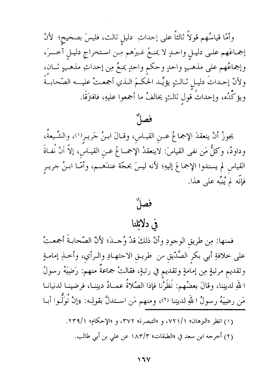 فمنها: مِن طريقِ الوجودِ وأنّ ذلكَ قد وُجدَ؛ لأنّ الصّحابةَ أجمعتْ على خلافةِ أبي بكرٍ الصِّدّيقِ من طريقِ الاجتهادِ والرأيِ، وأخذِ إمامةٍ وتقديمِ مرتبةٍ مِن إمامةٍ وتقديمٍ في رتبةٍ، فقالتْ جماعة منهم: رَضِيَهُ رسول اللهِ لديننا، وقالَ بعضُهم: نَظرنا فإذا الصّلاةُ عمادُ ديينا، فرضينا لدنيانا مَن رضِيَهُ رسولُ اللهِ لديننا (٢)، ومنهم مَن أستدلَّ بقولِه: "إنْ تُوَلُّوا أبا