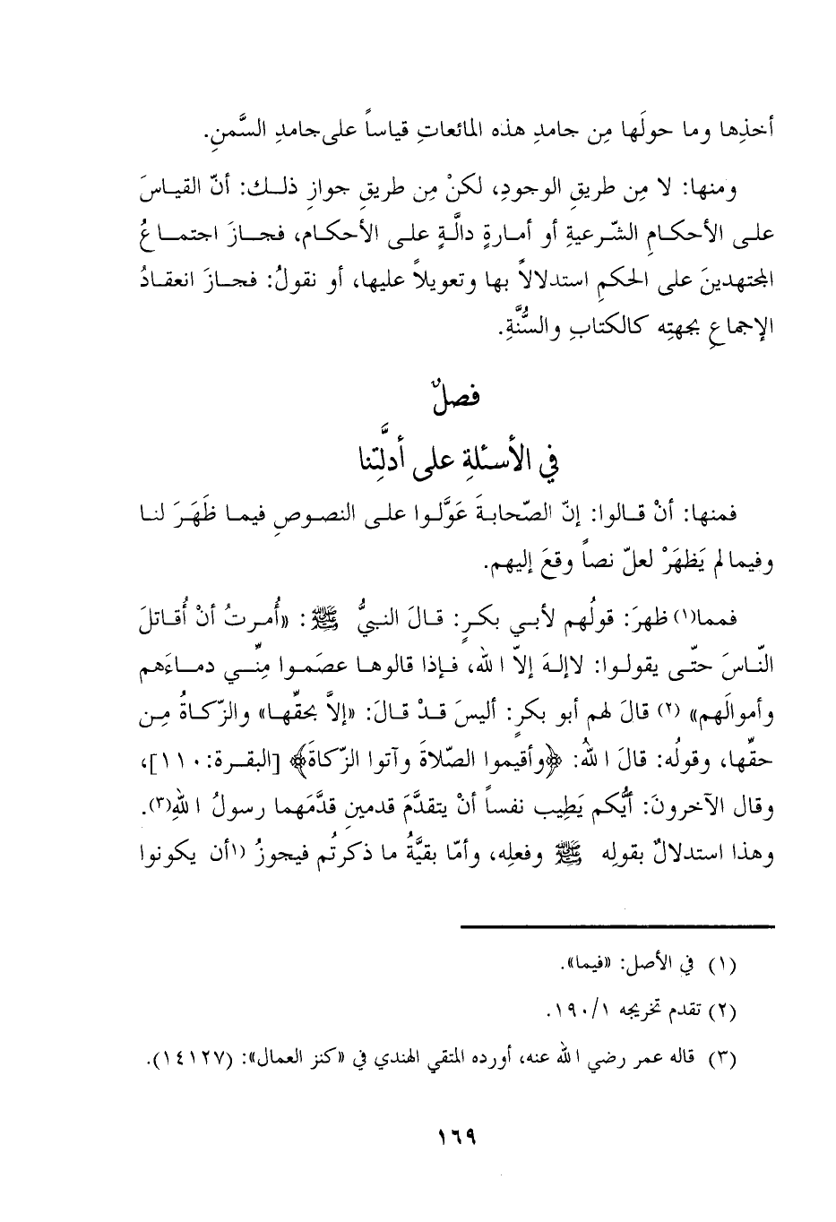 فمنها: أنْ قالوا: إنّ الصّحابةَ عَوَّلوا على النصوصِ فيما ظَهَرَ لنا وفيمالم يَظهَرْ لعلّ نصاً وقعَ إليهم.