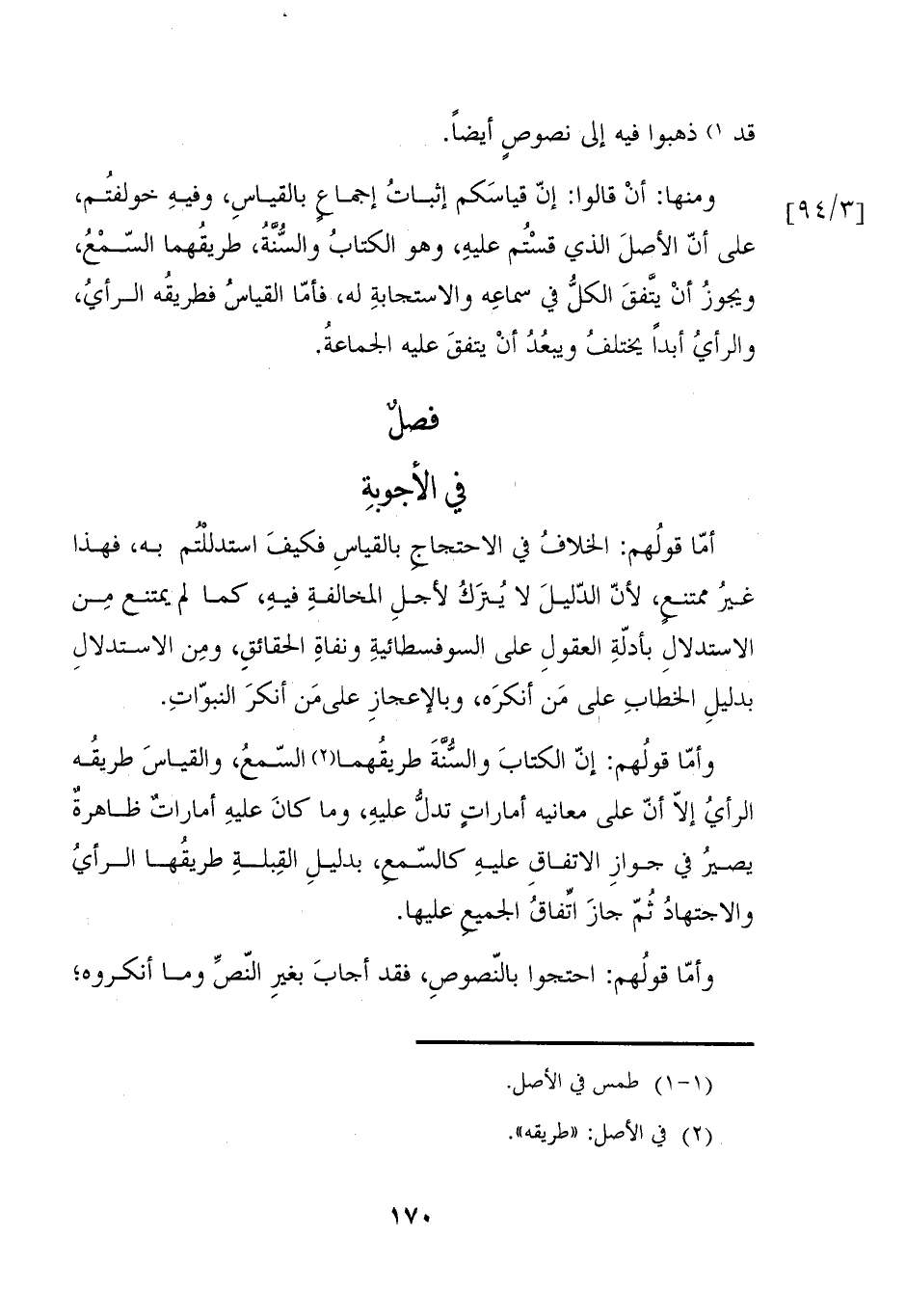 وأمّا قولُهم: إنّ الكتابَ والسُّنةَ طريقُهما (٢) السّمعُ، والقياسَ طريقُه الرأيُ إلاّ أنّ على معانيه أماراتٍ تدلُّ عليهِ، وما كانَ عليهِ أمارات ظاهرةٌ يصيرُ في جوازِ الاتفاقِ عليهِ كالسّمع، بدليلِ القِبلةِ طريقُها الرأيُ والاجتهادُ ثُمّ جازَ اتفاقُ الجميع عليها.