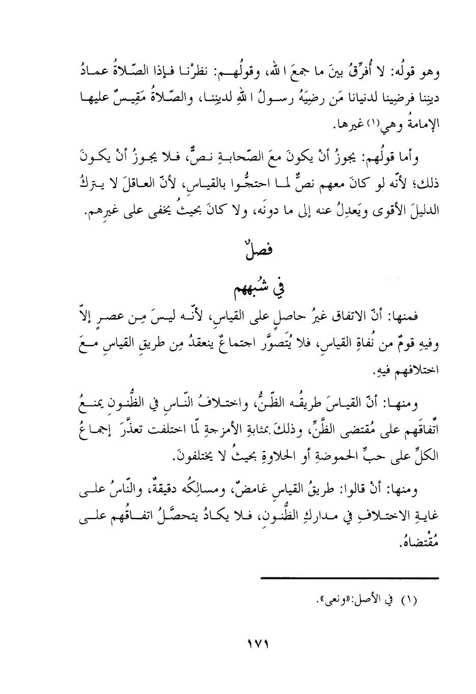 وهو قولُه: لا أُفرِّقُ بينَ ما جمعَ الله، وقولُهم: نظرْنا فإذا الصّلاة عماد ديننا فرضِينا لدنيانا مَن رضِيَهُ رسولُ اللهِ لديننا، والصّلاةُ مَقِيسٌ عليها الإمامةُ وهي (١) غيرها.