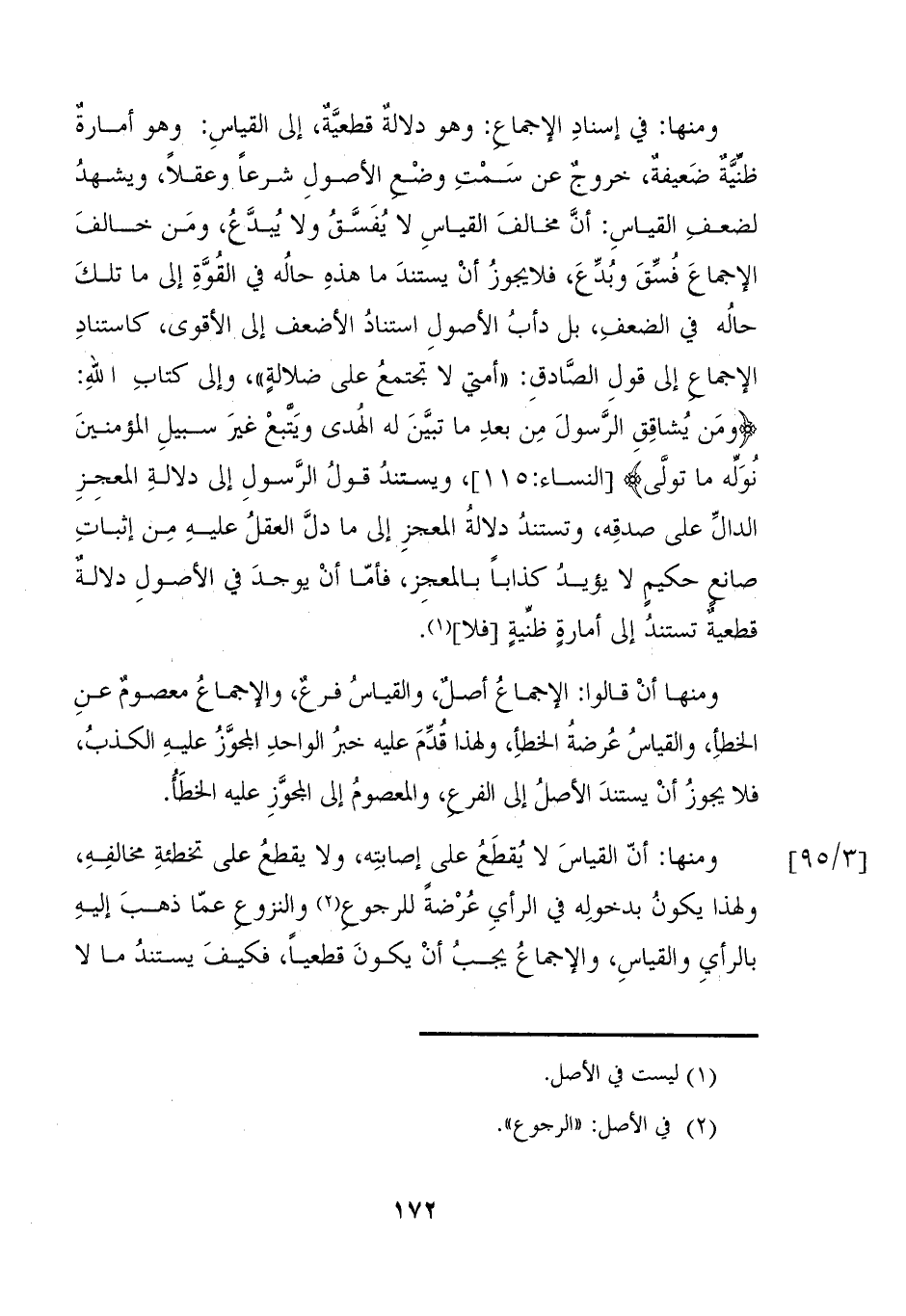 ومنها: في إسنادِ الإجماع: وهو دلالةٌ قطعيَّةٌ، إلى القياسِ: وهو أمارةٌ ظنيَّةٌ ضَعيفةٌ، خروجٌ عن سَمْتِ وضْع الأصولِ شرعاً وعقلاً، ويشهدُ لضعفِ القياسِ: أنَّ مخالف القياسِ لا يُفَسَّقُ ولا يُبدَّعُ، ومَن خالفَ الإجماعَ فسِّقَ وبُدِّعَ، فلا يجوزُ أنْ يستندَ ما هذهِ حالُه في القُوَّةِ إلى ما تلكَ حالُه في الضعفِ، بل دأبُ الأصولِ استنادُ الأضعف إلى الأقوى، كاستنادِ الإجماع إلى قولِ الصَّادقِ: "أمتي لا تجتمعُ على ضلالةٍ"، وإلى كتابِ اللهِ: {وَمَنْ يُشَاقِقِ الرَّسُولَ مِنْ بَعْدِ مَا تَبَيَّنَ لَهُ الْهُدَى وَيَتَّبِعْ غَيْرَ سَبِيلِ الْمُؤْمِنِينَ نُوَلِّهِ مَا تَوَلَّى} [النساء: ١١٥]،، ويستند قولُ الرَّسولِ إلى دلالةِ المعجِزِ الدالِّ على صدقِه، وتستندُ دلالةُ المعجزِ إلى ما دلَّ العقلُ عليهِ مِن إثباتِ صانع حكيمٍ لا يؤيد كذاباً بالعجِز، فأمّا أنْ يوجدَ في الأصولِ دلالةٌ قطعيةٌ تستندُ إلى أمارةٍ ظنِّيةٍ [فلا] (١).