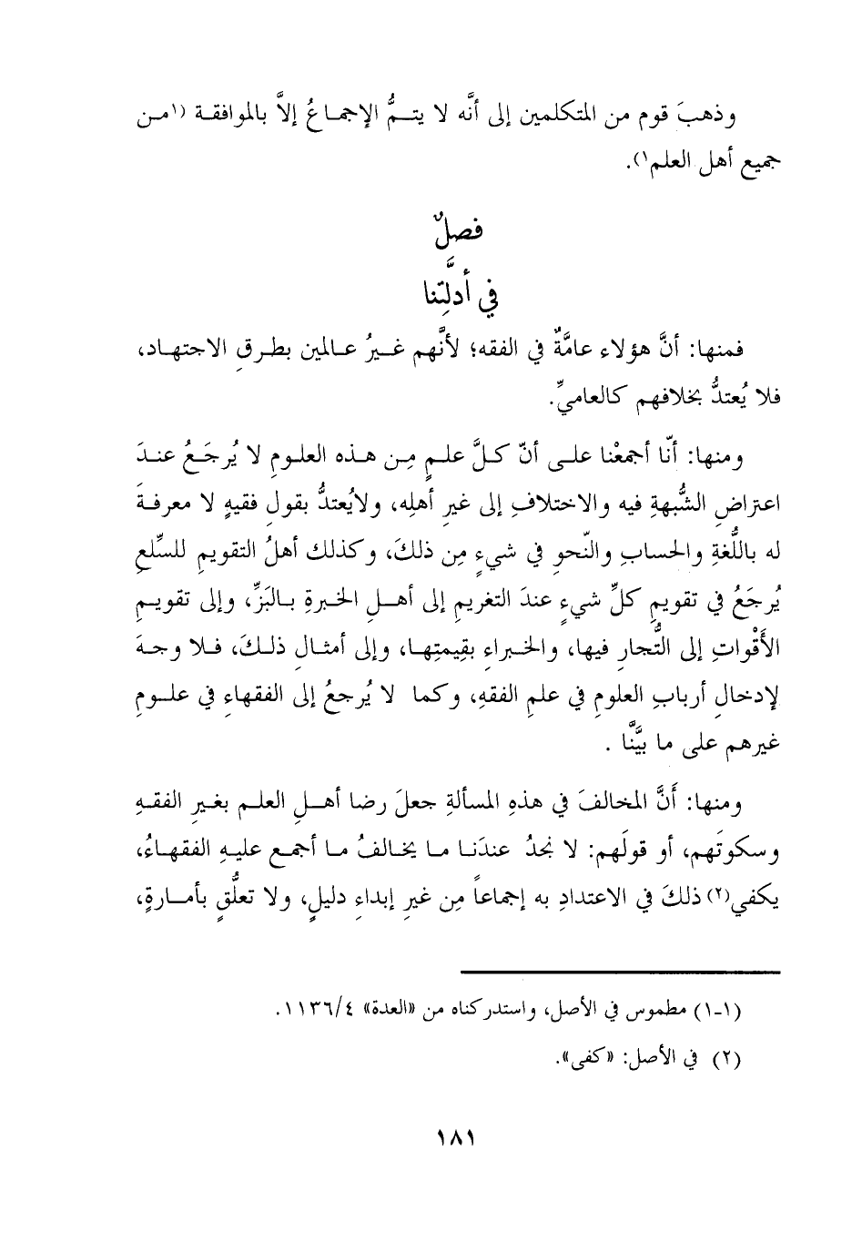 ومنها: أَنَّ المخالفَ في هذهِ المسألةِ جعلَ رضا أهلِ العلم بغيرِ الفقهِ وسكوتَهم، أو قولَهم: لا نجدُ عندَنا ما يخالفُ ما أجمع عليهِ الفقهاءُ، يكفي (٢) ذلكَ في الاعتدادِ به إجماعاً مِن غيرِ إبداءِ دليلٍ، ولا تعلّقٍ بأمارةٍ،