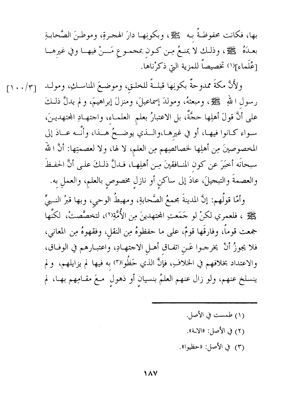 ولأَنَّ مكةَ ممدوحةٌ بكونِها قبلةً للخلقِ، وموضعَ المناسكِ، ومولد رسولِ اللهِ - صلى الله عليه وسلم -، ومبعثهُ، ومولدَ إسماعيلَ، ومنزلَ إبراهيمَ، ولم يدلَّ ذلكَ على أنَّ قولَ أهلِها حجةٌ، بل الاعتبارُ بعلمِ العلماءِ، واجتهادِ المجتهدينَ، سواء كانوا فيها، أو في غيرِها، والذي يوضحُ هذا، وأنَّه عادَ إلى الخصوصينَ مِن أهلِها لخصائصِهم مِن العلمِ، لا لها، ولا لعصمتِها: أنَّ الله سبحانَه اُخبَرَ عن كون المنافقينَ مِن أهلِها، فدلَّ ذلكَ على اُن الحفظَ والعصمةَ والتبجيلَ، عادَ إلى ساكنٍ أو نازلي مخصوصٍ بالعلمِ، والعملِ بِه.