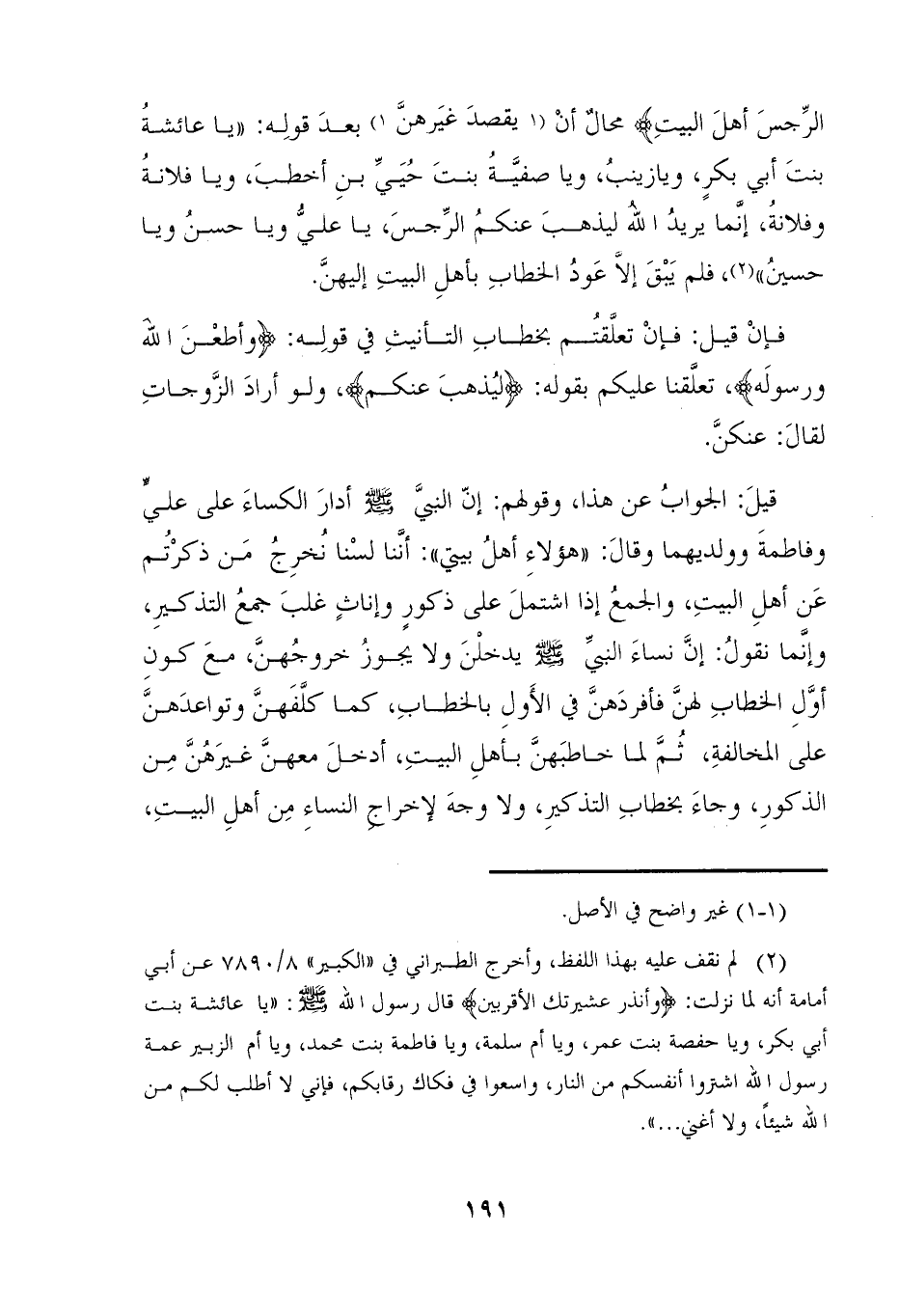 قيلَ: الجوابُ عن هذا، وقولهم: إنّ النبيَّ - صلى الله عليه وسلم - أدارَ الكساءَ على علي وفاطمةَ وولديهما وقالَ: "هؤلاءِ أهلُ بيتي": أنَّنا لسْنا نُخرِجُ مَن ذكرْتم عَن أهلِ البيتِ، والجمعُ إذا اشتملَ على ذكورٍ وإناثٍ غلبَ جمعُ التذكيرِ، وإنَّما نقولُ: إنَّ نساءَ النبيِّ - صلى الله عليه وسلم - يدخلْنَ ولا يجوزُ خروجُهنَّ، معَ كون أوَّلِ الخطابِ لهنَّ فأفردَهنَّ في الأَولِ بالخطابِ، كما كلفَهنَّ وتواعدَهنًّ على المخالفةِ، ثمَّ لما خاطبَهنَّ بأهلِ البيتِ، أدخل معهنَّ غيرَهُنَّ مِن الذكورِ، وجاءَ بخطابِ التذكيرِ، ولا وجهَ لإخراج النساء مِن أهلِ البيتِ،