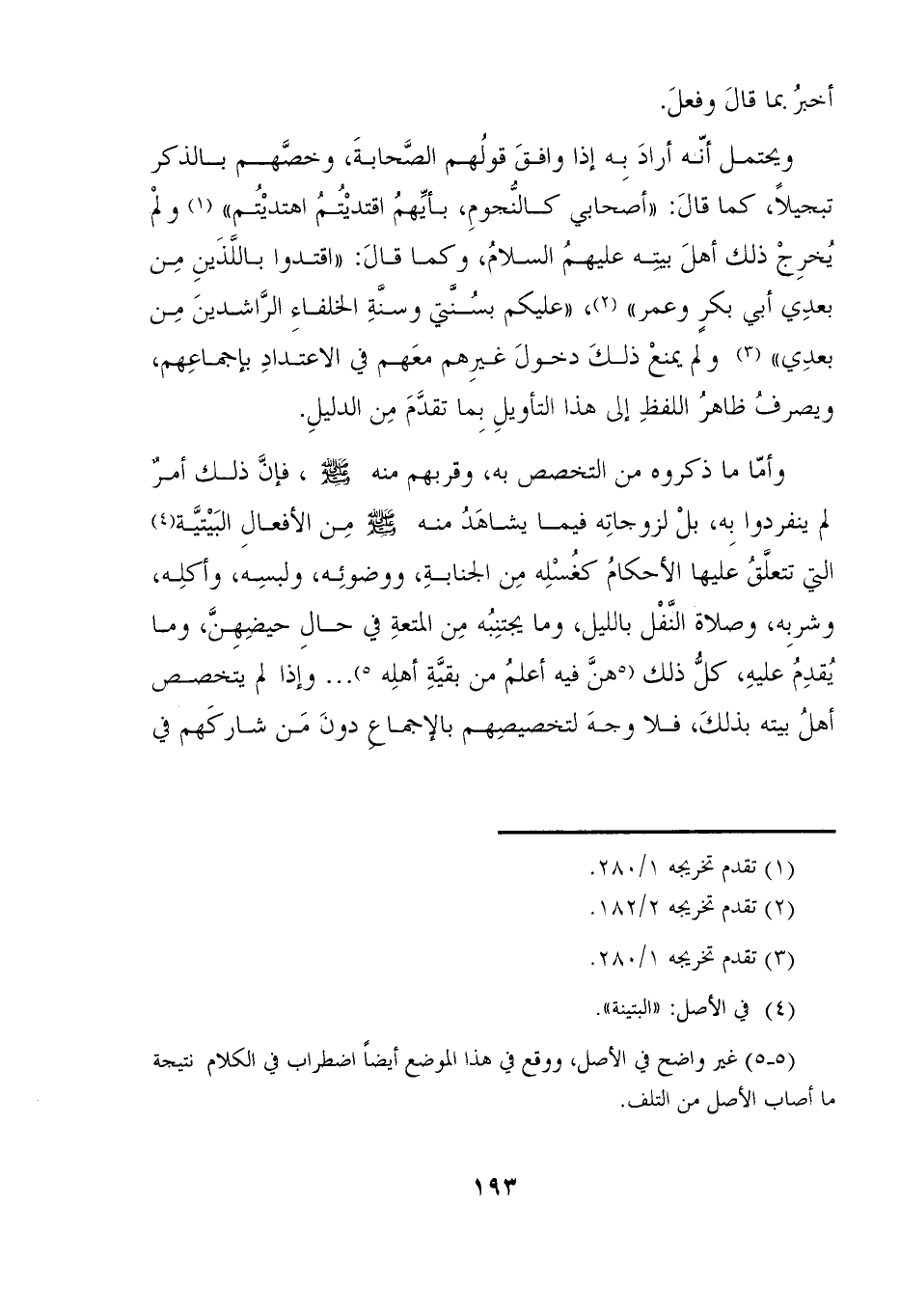 وأمّا ما ذكروه من التخصص به، وقربهم منه - صلى الله عليه وسلم -، فإنَّ ذلك أمرٌ لم ينفردوا بِه، بلْ لزوجاتِه فيما يشاهَدُ منه - صلى الله عليه وسلم - مِن الأفعالِ البَيْتيَّة (٤) التي تتعلَّقُ عليها الأحكامُ كغُسْلِه مِن الجنابةِ، ووضوئِه، ولبسِه، وأكلِه، وشربه، وصلاة النَّفْل بالليل، وما يجتنِبُه مِن المتعةِ في حالِ حيضِهِنَّ، وما يُقدِمُ عليهِ، كلُّ ذلك (٥ هنَّ فيه أعلمُ من بقيَّةِ أهلِه ٥) ... وإذا لم يتخصص أهلُ بيته بذلكَ، فلا وجهَ لتخصيصِهم بالإجماع دونَ مَن شاركَهم في