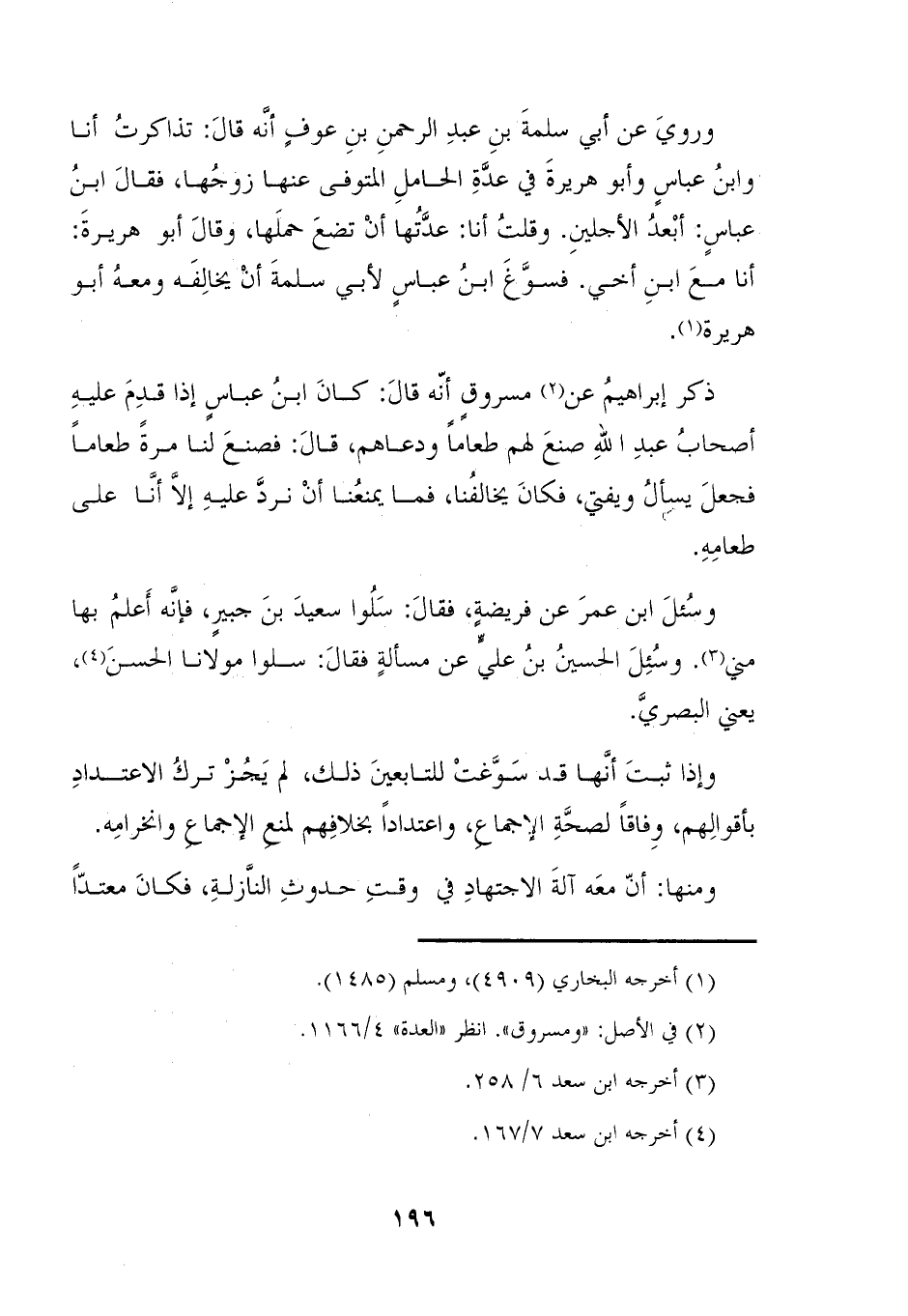 ورويَ عن أبي سلمةَ بنِ عبدِ الرحمنِ بنِ عوفٍ أنه قالَ: تذاكرتُ أنا وابن عباسٍ وأبو هريرةَ في عدَّةِ الحاملِ المتوفى عنها زوجُها، فقالَ ابن عباسٍ: أبْعدُ الأجلينِ. وقلتُ أنا: عدَّتُها أنْ تضعَ حملَها، وقالَ أبو هريرةَ: أنا معَ ابن أخي. فسوَّغَ ابن عباسٍ لأبي سلمةَ أن يخالِفَه ومعهُ أبو هريرة (١).