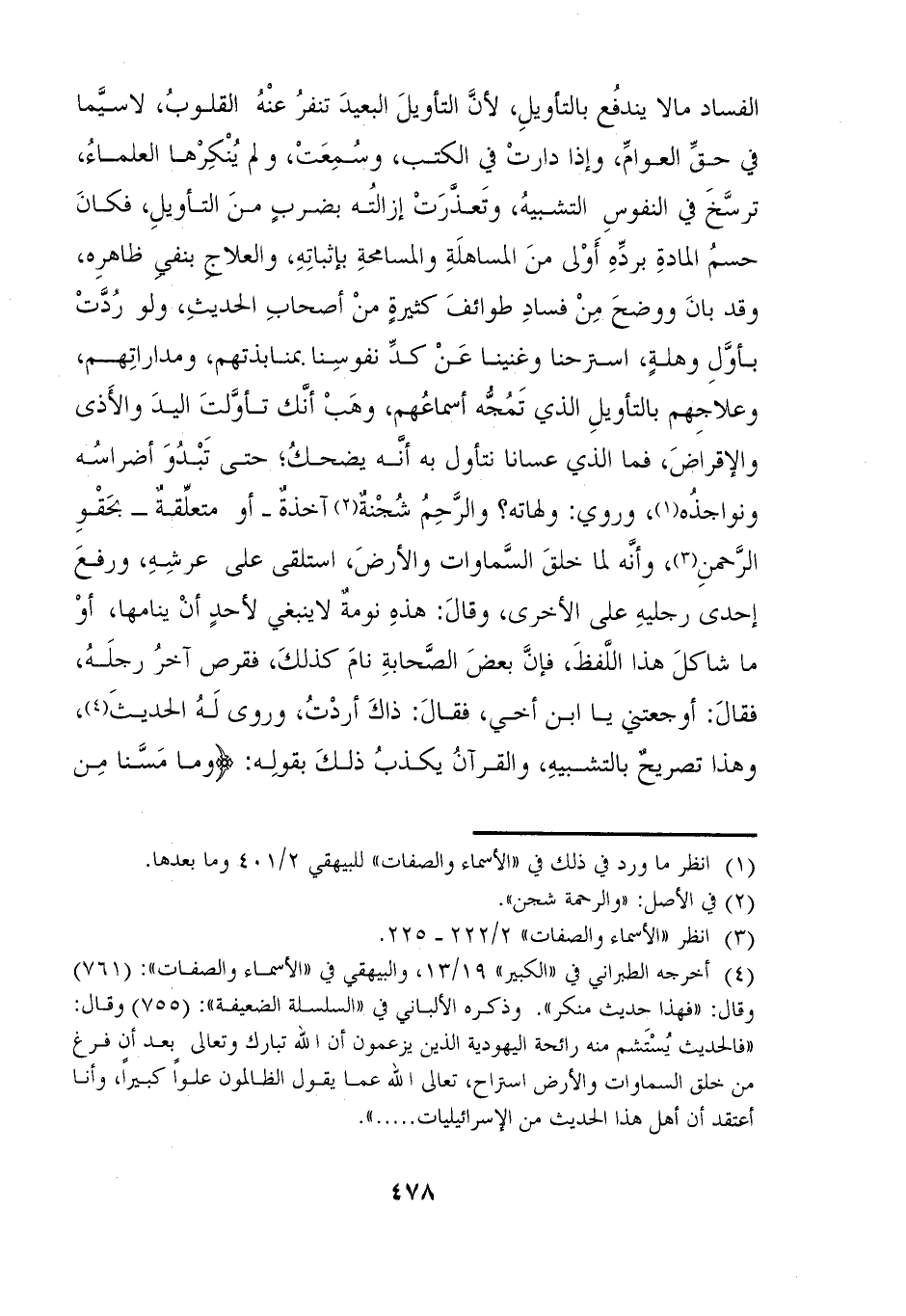الفساد مالا يندفُع بالتأويلِ، لأنَّ التأويلَ البعيدَ تنفرُ عنْهُ القلوبُ، لاسيَّما في حقِّ العوامِّ، وإذا دارتْ في الكتب، وسُمِعَتْ، ولم يُنكِرْها العلماءُ، ترسَّخَ في النفوسِ التشبيهُ، وتَعذَّرَتْ إزالته بضربٍ منَ التأويلِ، فكانَ حسمُ المادةِ بردِّهِ أَوْلى منَ المساهلَةِ والمسامحةِ بإثباتِهِ، والعلاج بنفى ظاهرِه، وقد بانَ ووضحَ مِنْ فسادِ طوائفَ كثيرةٍ منْ أصحابِ الحديث، وُلو ردَّتْ بأوَّلِ وهلةٍ، استرحنا وغنينا عَنْ كدِّ نفوسِنا بمنابذتهم، ومداراتِهم، وعلاجِهم بالتأويلِ الذي تَمُجُّه أسماعُهم، وهَبْ أنك تأوَّلتَ اليدَ والأَذى والإقراضَ، فما الذي عسانا نتأول به أنَّه يضحكُ، حتى تَبْدُوَ أضراسُه ونواجذُه (١)، وروي: ولهاته؛ والرَّحِمُ شُجْنةٌ (٢) آخذةٌ - أو متعلِّقةٌ - بحَقْوِ الرَّحمنِ (٣)، وأنَّه لما خلقَ السَّماوات والأرضَ، استلقى على عرشِهِ، ورفعَ إحدى رجليهِ على الأخرى، وقالَ: هذهِ نومةٌ لاينبغي لأحدٍ أنْ ينامها، أوْ ما شاكلَ هذا اللًفظَ، فإنَّ بعضَ الصَّحابةِ نامَ كذلكَ، فقرص آخرُ رجلَهُ، فقالَ: أوجعتني يا ابن أخي، فقالَ: ذاكَ أردْتُ، وروى لَهُ الحديثَ (٤)، وهذا تصريحٌ بالتشبيهِ، والقرآنُ يكذبُ ذلكَ بقولِه: {وَمَا مَسَّنَا مِنْ