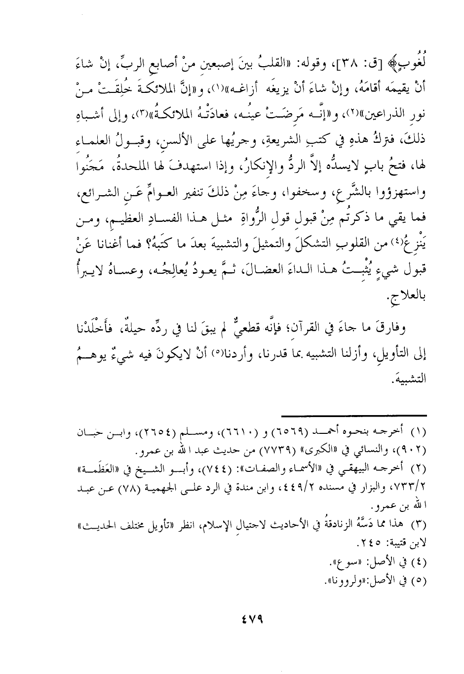 لُغُوبٍ} [ق: ٣٨]، وقوله: "القلبُ بينَ إصبعينِ منْ أصابع الربِّ، إنْ شاءَ أنْ يقيمَه أقامَهُ، وإن شاءَ أن يزيغَه أزاغه" (١)، و"إنَّ الملائكةَ خلِقَتْ من نورِ الذراعين" (٢)، و"إنَّه مَرِضَتْ عينه، فعادَتْة الملائكةُ" (٣)، وإلى أشباهِ ذلكَ، فتركُ هذهِ في كتبِ الشريعةِ، وجريُها على الألسنِ، وقبولُ العلماءِ لها، فتحُ بابٍ لايسدُّه إلاَّ الردُّ والإِنكارُ، وإذا استهدفَ لها الملحدةُ، مَجَنُوا واستهزؤوا بالشَّرع، وسخفوا، وجاءَ مِنْ ذلكَ تنفير العوامِّ عَنِ الشرائع، فما يقي ما ذكرتُم مِنْ قبولِ قولِ الرُّواةِ مثل هذا الفسادِ العظيمِ، ومن يَنْزِعُ (٤) من القلوبِ التشكلَ والتمثيلَ والتشبيهَ بعدَ ما كتَبهُ؛ فما أغنانا عَنْ قبول شيءٍ يُثْبِتُ هذا الداءَ العضالَ، ثمَّ يعودُ يُعالِجُه، وعساهُ لايبرأُ بالعلاج.