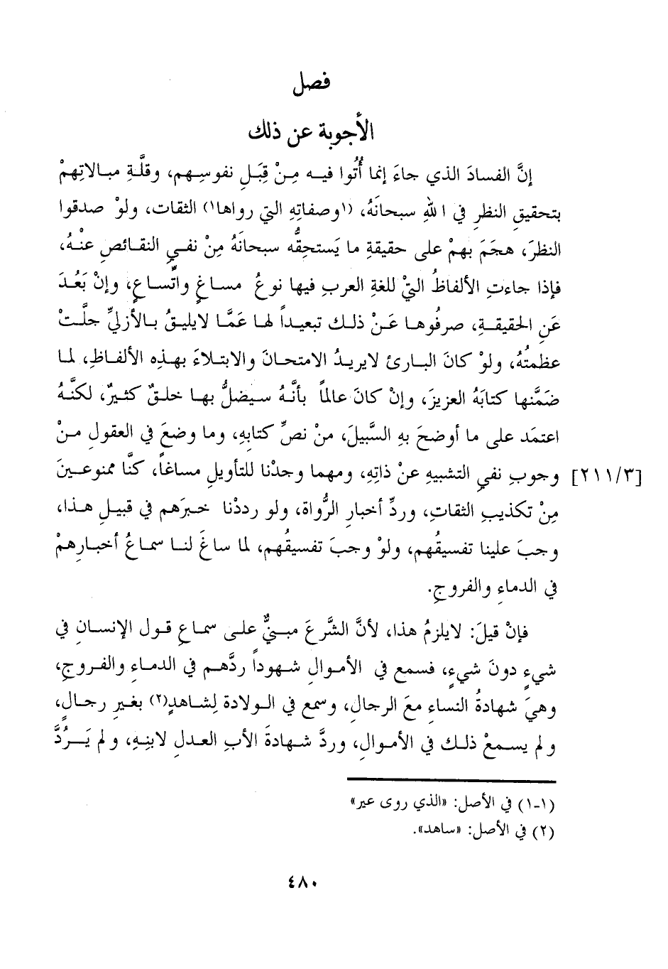 إنَّ الفسادَ الذي جاءَ إنما اتُوا فيه مِنْ قِبَلِ نفوسِهم، وقلةِ مبالاتِهمْ بتحقيقِ النظرِ في اللهِ سبحانَهُ، (١ وصفاتِهِ التي رواها ١) الثقات، ولوْ صدقوا النظرَ، هجَمَ بهمْ على حقيقةِ ما يَستحِقّه سبحانَهُ مِنْ نفي النقائصِ عنْهُ، فإذا جاءتِ الألفاظُ التيْ للغةِ العربِ فيها نوعُ مساغ واتِّساع، وإنْ بَعُدَ عَنِ الحقيقةِ، صرفُوها عَنْ ذلك تبعيداً لها عَمَّا لايليقُ بالأزليِّ جلّتْ عظمتُهُ، ولوْ كانَ البارئ لايريدُ الامتحانَ والابتلاءَ بهذِه الألفاظِ، لما ضَمَّنها كتابَهُ العزيزَ، وإنْ كانَ عالماً بأنَّهُ سيضلُّ بها خلقٌ كثيرٌ، لكنَّهُ اعتمَد على ما أوضحَ بهِ السَّبيلَ، منْ نصِّ كتابِهِ، وما وضعَ في العقولِ منْ وجوبِ نفي التشبيهِ عنْ ذاتِهِ، ومهما وجدْنا للتأويلِ مساغاً، كنا ممنوعينَ مِنْ تكذيب الثقاتِ، وردِّ أخبارِ الرُّواة، ولو رددْنا خبرَهم في قبيلِ هذا، وماَ علينا تفسيقُهم، ولوْ وجب تفسيقُهم، لما ساغَ لنا سماعُ أخبارِهمْ في الدماءِ والفروج.