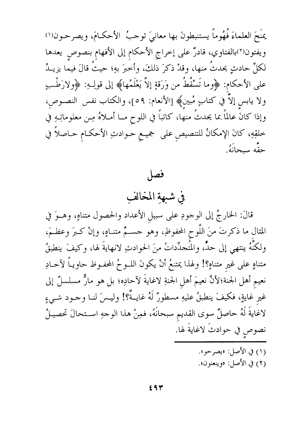 يمنَحَ العلماءَ فُهُوماً يستنبطونَ بها معانىَ توجبُ الأحكامَ، ويصرحون (١) ويفتون (٢) بالفتاوي، قادرٌ على إخراج الأحكامِ إلى الأفهامِ بنصوص يعدها لكلِّ حادثٍ يحدثُ منها، وقدْ ذكرَ ذلكَ، وأخبرَ بهِ، حيثُ قالَ فيما يزيدُ على الأحكام: {وَوَمَا تَسْقُطُ مِنْ وَرَقَةٍ إِلَّا يَعْلَمُهَا} إلى قولِهِ: {وَلَا رَطْبٍ وَلَا يَابِسٍ إِلَّا فِي كِتَابٍ مُبِينٍ} [الأنعام: ٥٩]، والكتاب نفس النصوصِ، وإذا كانَ عالماً بما يحدثُ منها، كاتباً في اللوح ما أملاهُ مِن معلوماتِهِ في خلقِهِ، كانَ الإمكانُ للتنصيصِ على جميع حوادثِ الأحكامِ حاصلاً في حقه سبحانَة.