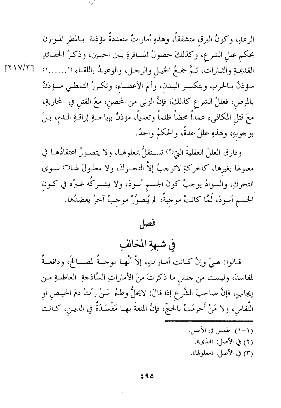 الرعدِ، وكونُ البرق متشققاً، وهذهِ أماراتٌ متعددةٌ مؤذنة بالمطرِ الموازن بحكمِ عللِ الشرع، وكذلكَ حصولُ المنافرةِ بين الحيين، وذكرُ الحقائدِ القديمةِ والثارات، ثمَّ جمعُ الخيلِ والرجل، والوعيدُ باللقاء (١. . . . . .١) مؤذنٌ بالحرب وبتكسر البدنِ، وألم الأعضاءِ، وتكررُ التمطي مؤذنٌ بالمرضِ، فعللُ الشرعِ كذلكَ؛ فإنَّ الزنى من المحصنِ، معَ القتلِ في المحاربةِ، معَ قتلِ الكافىء عمداَ محضاً ظلماً وتعدياً، مؤذنٌ بإباحةِ إراقةِ الدمِ، بلْ بوجوبِهِ، وهذهِ عللٌ عدةٌ، والحكمُ واحدٌ.