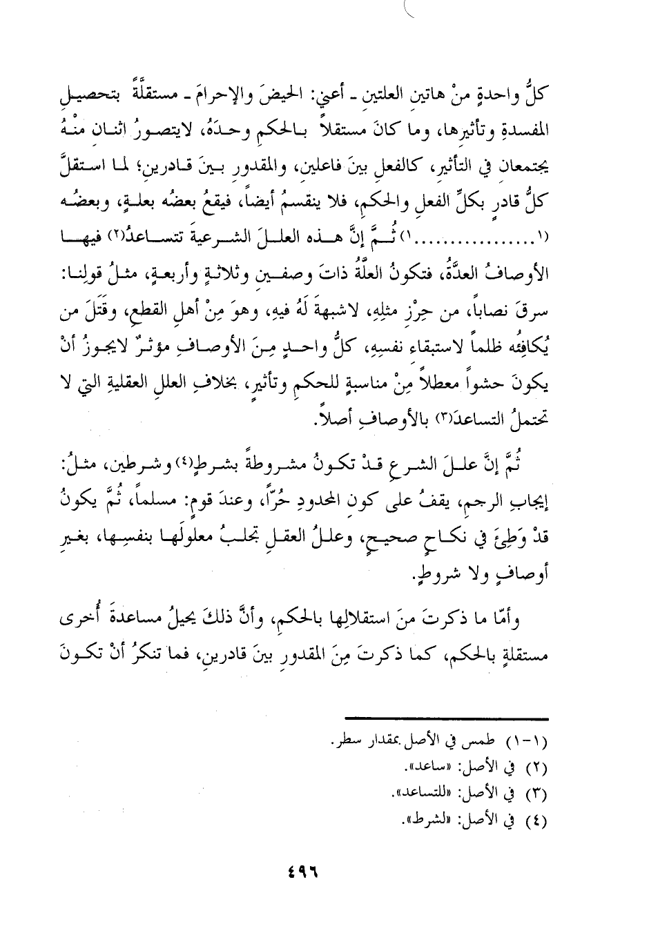 كل واحدةٍ منْ هاتينِ العلتينِ -أعني: الحيضَ والإحرامَ- ميستقلَّةً بتحصيلِ المفسدةِ وتأثيرِها، وما كانَ مستقلاً بالحكمِ وحدَهُ، لايتصور اثنانِ منْة يجتمعان في التأثيرِ، كالفعلِ بينَ فاعلينِ، والمقدورِ بينَ قادرينِ؛ لما استقلَّ كلُّ قادَرٍ بكل الفعلِ والحكمِ، فلا ينقسمُ أيضاً، فيقعُ بعضه بعلةٍ، وبعضُه (١. . . . . . . . . .. . ١) ثُمَ إنَّ هذه العللَ الشرعيةَ تتساعد (٢) فيها الأوصافُ العدَّةُ، فتكونُ العلةُ ذاتَ وصفينِ وثلاثةٍ وأربعةٍ، مثل قولِنا: سرقَ نصاباً، من حِرْزِ مثلِهِ، لاشبهةَ لَهُ فيهِ، وهوَ مِنْ أهلِ القطع، وقَتَلَ من يُكافِئُه ظلماً لاستبقاءِ نفسِهِ، كلُّ واحدٍ مِنَ الأوصافِ مؤثرٌ لايجوز أنْ يكونَ حشواً معطلاً مِنْ مناسبةٍ للحكمِ وتأثيرٍ، بخلافِ العللِ العقليةِ التي لا تحتملُ التساعدَ (٣) بالأوصافِ أصلاً.