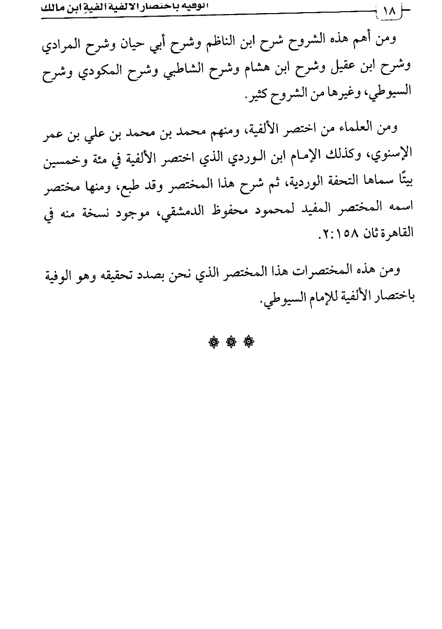 ومن هذه المختصرات هذا المختصر الذي نحن بصدد تحقيقه وهو الوفية باختصار الألفية للإمام السيوطي.