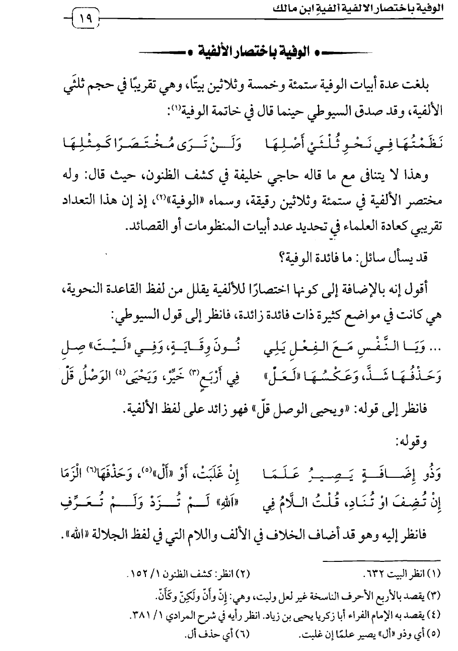 وهذا لا يتنافى مع ما قاله حاجي خليفة في كشف الظنون، حيث قال: ""وله مختصر الألفية في ستمئة وثلاثين رقيقة، وسماه "الوفية" (¬٢)، إذ إن هذا التعداد تقريبي كعادة العلماء في تحديد عدد أبيات المنظومات أو القصائد.