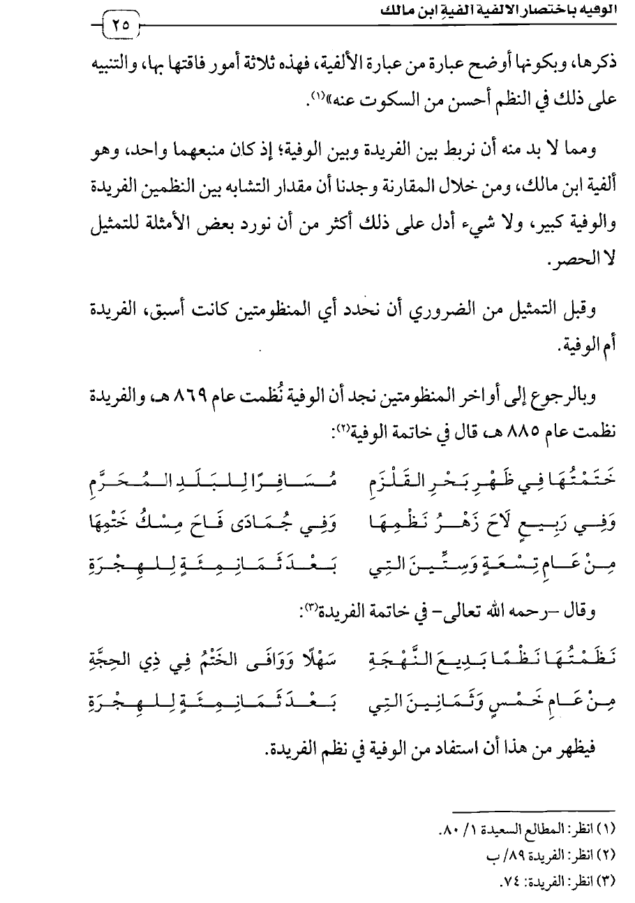 وبالرجوع إلى أواخر المنظومتين نجد أن الوفية نُظمت عام ٨٦٩ هـ، والفريدة نظمت عام ٨٨٥ هـ، قال في خاتمة الوفية (¬٢):