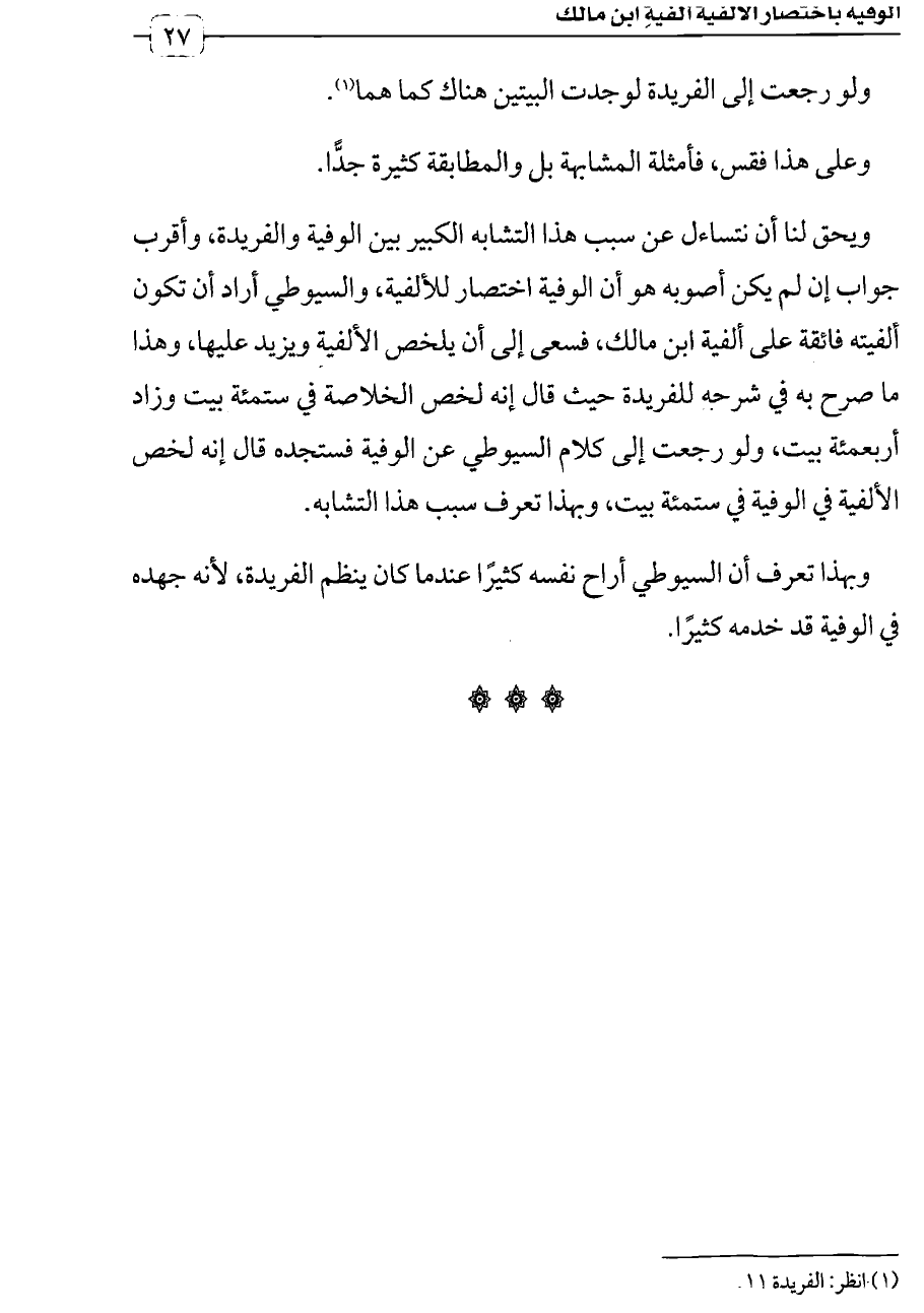 وبهذا تعرف أن السيوطي أراح نفسه كثيرًا عندما كان ينظم الفريدة، لأنه جهده في الوفية قد خدمه كثيرًا.