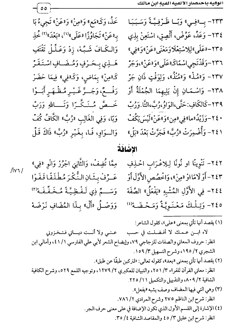 ٢٤٢. تَنْوِينًا او نُونًا لِلِاعْرَابِ احْذِفِ ... مِمَّا تُضِفْ، وَالثَّانِيَ اجْرُرْ وَانْوِ "فِي"