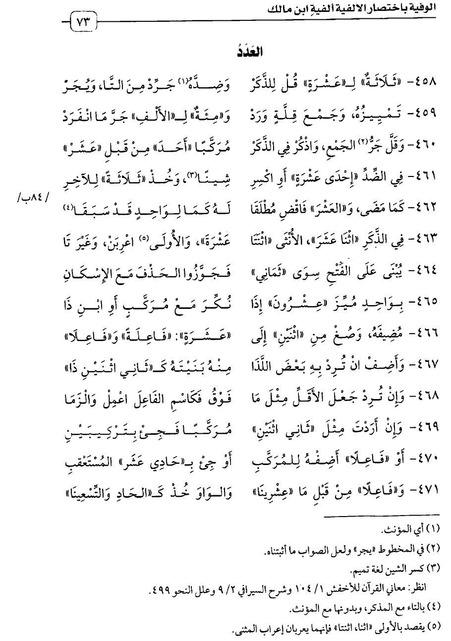 ٤٥٨. "ثَلَاثَةٌ" لِـ"عَشْرَةٍ" قُلْ لِلذَّكَرْ ... وَضِدَّهُ (¬١) جَرِّدْ مِنَ التَّا، وَيُجَرّْ