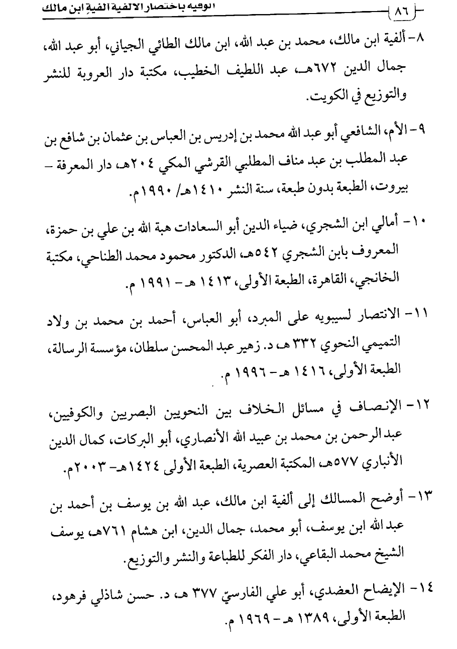 ١٣. أوضح المسالك إلى ألفية ابن مالك، عبد الله بن يوسف بن أحمد بن عبد الله ابن يوسف، أبو محمد، جمال الدين، ابن هشام ٧٦١ هـ، يوسف الشيخ محمد البقاعي، دار الفكر للطباعة والنشر والتوزيع.