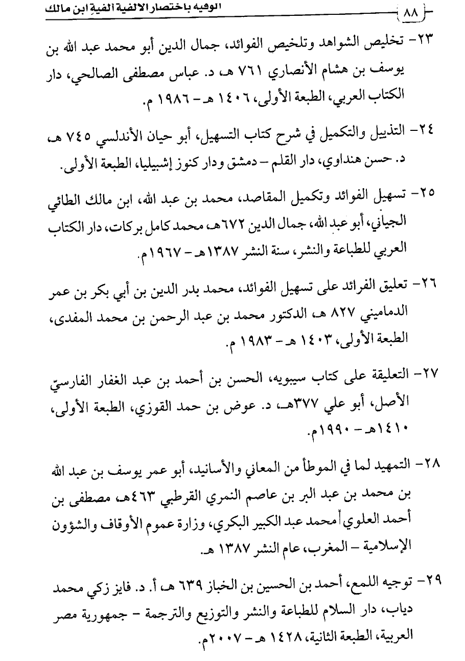 ٢٥. تسهيل الفوائد وتكميل المقاصد، محمد بن عبد الله، ابن مالك الطائي الجياني، أبو عبد الله، جمال الدين ٦٧٢ هـ، محمد كامل بركات، دار الكتاب العربي للطباعة والنشر، سنة النشر ١٣٨٧ هـ - ١٩٦٧ م.