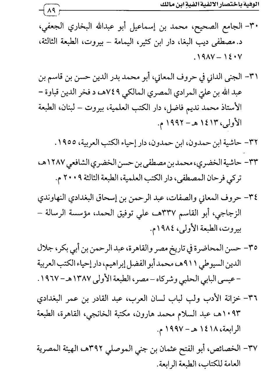 ٣١. الجنى الداني في حروف المعاني، أبو محمد بدر الدين حسن بن قاسم بن عبد الله بن عليّ المرادي المصري المالكي ٧٤٩ هـ، د فخر الدين قباوة - الأستاذ محمد نديم فاضل، دار الكتب العلمية، بيروت - لبنان، الطبعة الأولى، ١٤١٣ هـ - ١٩٩٢ م.