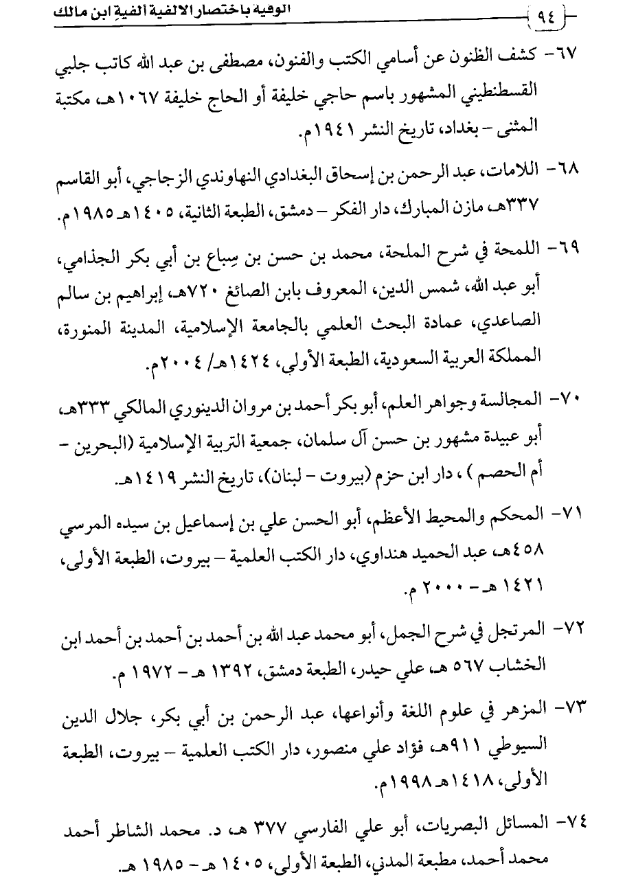 ٦٧. كشف الظنون عن أسامي الكتب والفنون، مصطفى بن عبد الله كاتب جلبي القسطنطيني المشهور باسم حاجي خليفة أو الحاج خليفة ١٠٦٧ هـ، مكتبة المثنى - بغداد، تاريخ النشر ١٩٤١ م.