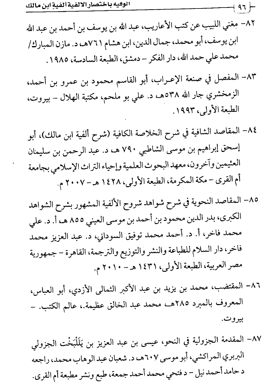 ٨٤. المقاصد الشافية في شرح الخلاصة الكافية (شرح ألفية ابن مالك)، أبو إسحق إبراهيم بن موسى الشاطبي ٧٩٠ هـ، د. عبد الرحمن بن سليمان العثيمين وآخرون، معهد البحوث العلمية وإحياء التراث الإسلامي بجامعة أم القرى - مكة المكرمة، الطبعة الأولى، ١٤٢٨ هـ - ٢٠٠٧ م.