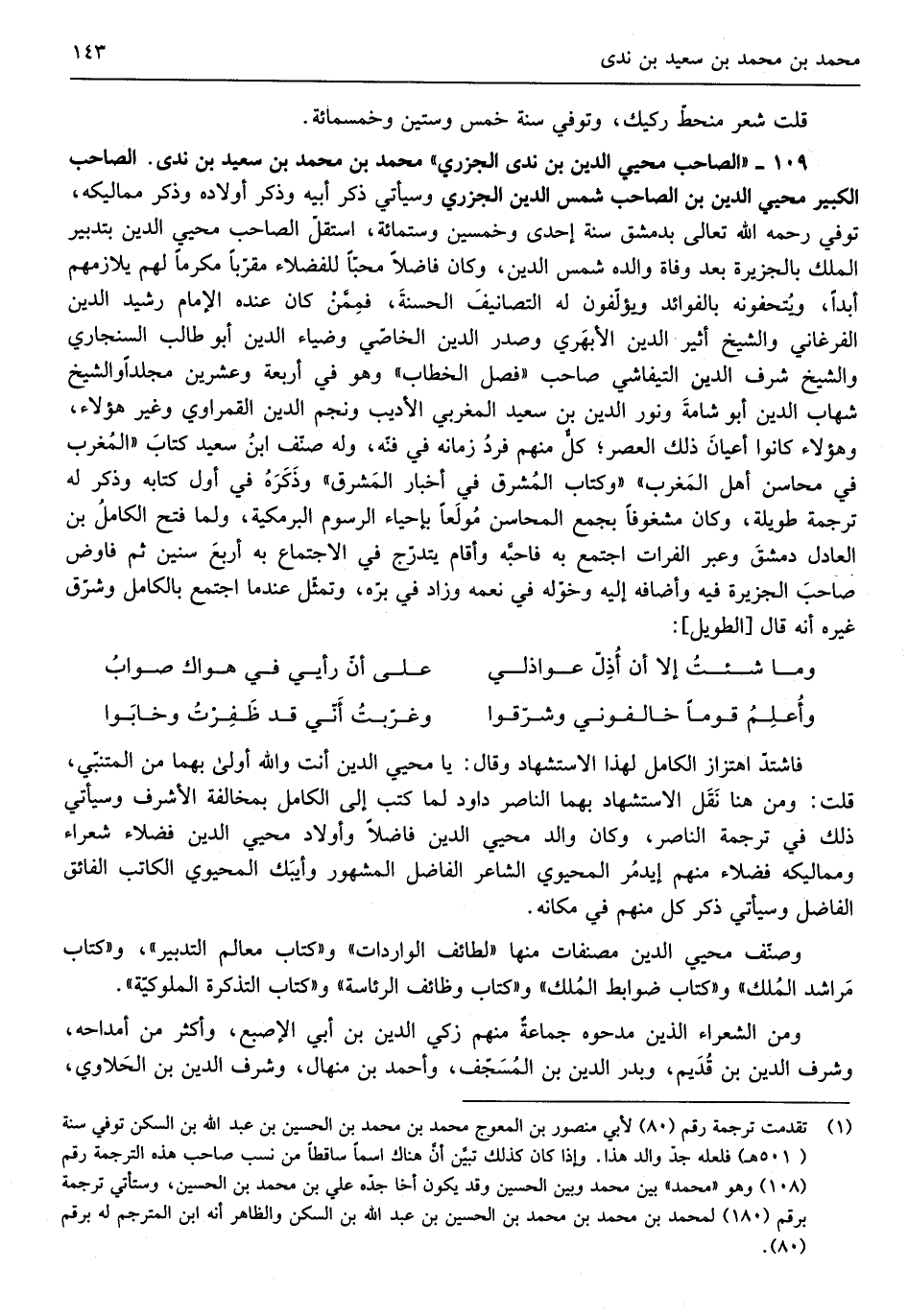 مُحَمَّد بن مُحَمَّد بن سعيد بن ندي الصاحب الْكَبِير محيي الدّين ابْن الصاحب شمس الدّين الْجَزرِي وَسَيَأْتِي ذكر أَبِيه وَذكر أَوْلَاده وَذكر مماليكه توفّي رَحمَه الله تَعَالَى بِدِمَشْق سنة إِحْدَى وَخمسين وسِتمِائَة اسْتَقل الصاحب محيي الدّين بتدبير الْملك بالجزيرة بعد وَفَاة وَالِده شمس الدّين وَكَانَ فَاضلا محباً للفضلاء مقربا مكرماً لَهُم يلازمهم أبدا ويتحفونه بالفوائد ويؤلفون لَهُ التصانيف الْحَسَنَة فَمِمَّنْ كَانَ عِنْده الإِمَام رشيد الدّين الفرغاني وَالشَّيْخ أثير الدّين الْأَبْهَرِيّ وَصدر الدّين الخاصي وضياء الدّين أَبُو طَالب السنجاري وَالشَّيْخ شرف الدّين التيفاشي صَاحب فصل الْخطاب وَهُوَ فِي أَرْبَعَة وَعشْرين مجلداً وَالشَّيْخ شهَاب الدّين أَبُو شامة وَنور الدّين ابْن سعيد المغربي الأديب وَنجم الدّين القمراوي وَغير هَؤُلَاءِ وَهَؤُلَاء كَانُوا أَعْيَان ذَلِك الْعَصْر كل مِنْهُم فَرد زَمَانه فِي فنه وَله صنف ابْن سعيد كتاب الْمغرب فِي محَاسِن أهل الْمغرب وَكتاب الْمشرق فِي أَخْبَار الْمشرق وَذكره فِي أول كِتَابه وَذكر لَهُ تَرْجَمَة طَوِيلَة وَكَانَ مشغوفاً بِجمع المحاسن مُولَعا بإحياء الرسوم البرمكية وَلما فتح الْكَامِل ابْن الْعَادِل دمشق وَعبر الْفُرَات اجْتمع بِهِ فَأَحبهُ وَأقَام يتدرج فِي الِاجْتِمَاع بِهِ أَربع سِنِين ثمَّ فاوض صَاحب الجزيرة فِيهِ وأضافه إِلَيْهِ وخوله فِي نعمه وَزَاد فِي بره وتمثل عِنْدَمَا اجْتمع بالكامل وشرق غَيره أَنه قَالَ الطَّوِيل