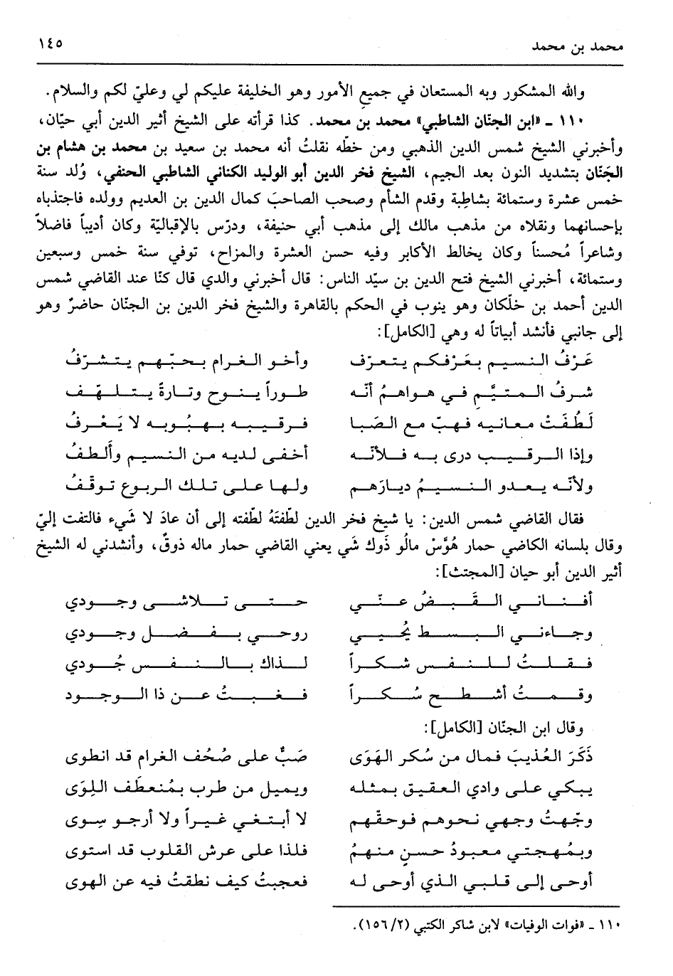مُحَمَّد بن مُحَمَّد كَذَا قرأته على الشَّيْخ أثير الدّين أبي حَيَّان وَأَخْبرنِي الشَّيْخ شمس الدّين الذَّهَبِيّ وَمن خطه نقلت أَنه مُحَمَّد بن سعيد بن مُحَمَّد بن هِشَام بن الْجنان بتَشْديد النُّون بعد الْجِيم الشَّيْخ فَخر الدّين أَبُو الْوَلِيد الْكِنَانِي الشاطبي الْحَنَفِيّ ولد سنة خمس عشرَة وسِتمِائَة بشاطب وَقدم الشأم وَصَحب الصاحب كَمَال الدّين ابْن العديم وَولده فاجتذباه بإحسانهما ونقلاه من مَذْهَب مَالك إِلَى مَذْهَب أبي حنيفَة ودرس بالإقبالية وَكَانَ أديباً فَاضلا وشاعراً محسناً وَكَانَ يخالط الأكابر وَفِيه حسن الْعشْرَة والمزاح توفّي سنة خمس وَسبعين وست مائَة أَخْبرنِي الشَّيْخ فتح الدّين ابْن سيد النَّاس قَالَ أَخْبرنِي وَالِدي قَالَ كُنَّا عِنْد القَاضِي شمس الدّين أَحْمد بن خلكان وَهُوَ يَنُوب فِي الحكم بِالْقَاهِرَةِ وَالشَّيْخ فَخر الدّين ابْن الْجنان حَاضر وَهُوَ إِلَى جَانِبي فَأَنْشد أبياتاً لَهُ وَهِي الْكَامِل
