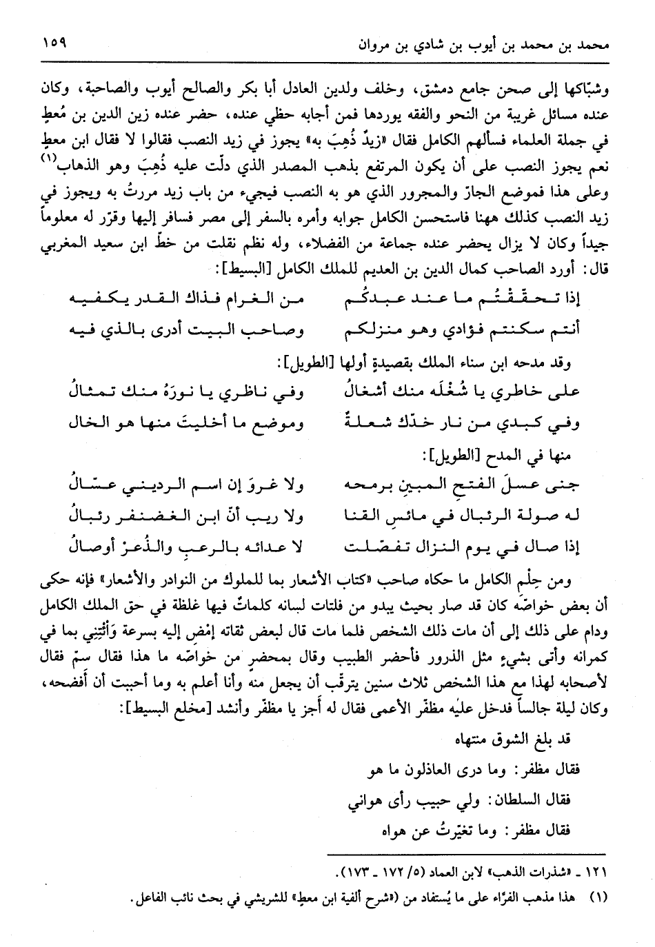 وشباكها إِلَى صحن جَامع دمشق وَخلف وَلدين الْعَادِل أَبَا بكر والصالح أَيُّوب والصاحبة وَكَانَ عِنْده مسَائِل غَرِيبَة من النَّحْو وَالْفِقْه ويوردها فَمن أَجَابَهُ حظي عِنْده حضر عِنْده زين الدّين ابْن معط فِي جملَة الْعلمَاء فَسَأَلَهُمْ الْكَامِل فَقَالَ زيد ذهب بِهِ يجوز فِي زيد النصب فَقَالُوا لَا فَقَالَ ابْن معط نعم يجوز النصب على أَن يكون الْمُرْتَفع بِذَهَب الْمصدر الَّذِي دلّت عَلَيْهِ ذهب وَهُوَ الذّهاب وعَلى هَذَا فموضع الْجَار وَالْمَجْرُور الَّذِي هُوَ بِهِ النصب فَيَجِيء من بَاب زيد مَرَرْت بِهِ وَيجوز فِي زيد النصب كَذَلِك هَهُنَا فَاسْتحْسن الْكَامِل جَوَابه وَأمره بِالسَّفرِ إِلَى مصر فسافر إِلَيْهَا وَقرر لَهُ مَعْلُوما جيدا وَكَانَ لَا يزَال يحضر عِنْده جمَاعَة من الْفُضَلَاء وَله نظم نقلت من خطّ ابْن سعيد المغربي قَالَ أورد الصاحب كَمَال الدّين ابْن العديم للْملك الْكَامِل الْبَسِيط