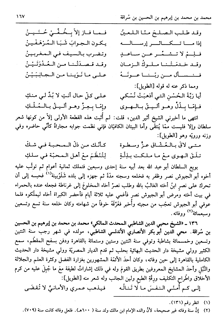 مُحَمَّد بن مُحَمَّد بن ابراهيم بن الْحُسَيْن بن سراقَة مُحي الدّين أَبُو بكر الْأنْصَارِيّ الأندلسي الشاطبي مولده فِي شهر رَجَب سنة اثْنَتَيْنِ وَتِسْعين وَخمْس مائَة بشاطبة وَتُوفِّي سنة اثْنَتَيْنِ وَسِتِّينَ وست مائَة بِالْقَاهِرَةِ وَدفن بسفح)