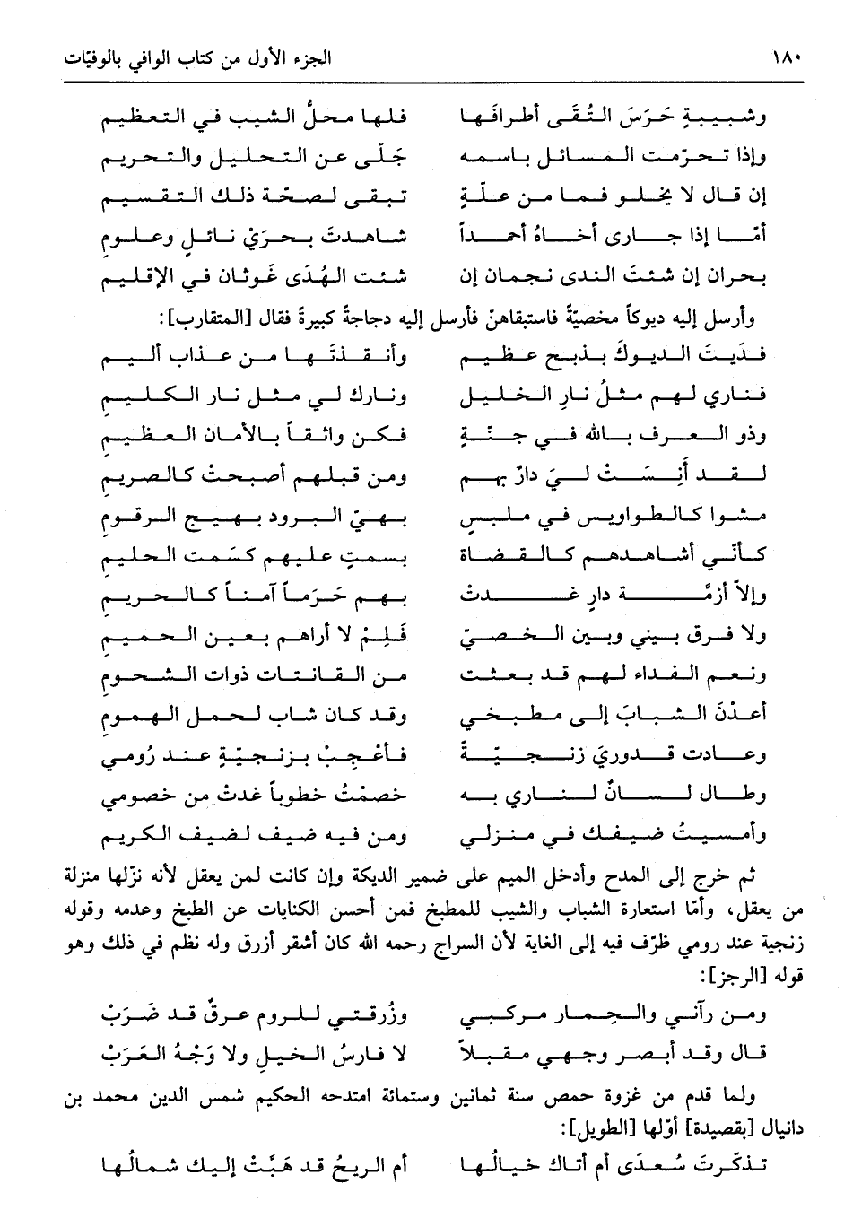 ثمَّ خرج إِلَى الْمَدْح وَأدْخل الْمِيم على ضمير الديكة وَإِن كَانَت لمن يعقل لِأَنَّهُ نزلها منزلَة من يعقل وَإِمَّا اسْتِعَارَة الشَّبَاب والشيب للمطبخ فَمن أحسن الْكِنَايَات عَن الطَّبْخ وَعَدَمه وَقَوله زنجية عِنْد رومي ظرف فِيهِ إِلَى الْغَايَة لإن السراج رَحمَه الله كَانَ أشقر أَزْرَق وَله نظم فِي ذَلِك وَهُوَ قَوْله الرجز