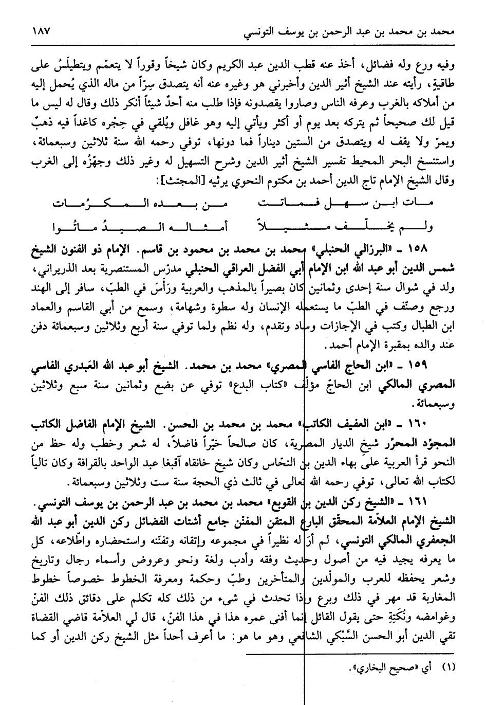 مُحَمَّد بن مُحَمَّد بن عبد الرَّحْمَن ابْن يُوسُف التّونسِيّ الشَّيْخ الإِمَام الْعَلامَة الْمُحَقق البارع المتقن المفنن جَامع أشتات الْفَضَائِل ركن الدّين أَبُو عبد الله الْجَعْفَرِي الْمَالِكِي التّونسِيّ لم أر لَهُ نظيراً فِي مَجْمُوعَة واتقانه وتفننه واستحضاره واطلاعه كل مَا يعرفهُ يجيد فِيهِ من أصُول وَحَدِيث وَفقه وأدب ولغة وَنَحْو وعروض وَأَسْمَاء رجال وتاريخ وَشعر يحفظه للْعَرَب والمولدين والمتأخرين وطب وَحِكْمَة وَمَعْرِفَة الخطوط خُصُوصا خطوط المغاربة قد مهر فِي ذَلِك وبرع وَإِذا تحدث فِي شَيْء من ذَلِك كُله تكلم على دقائق ذَلِك الْفَنّ وغوامضه ونكته حَتَّى يَقُول الْقَائِل إِنَّمَا أفنى عمره هَذَا فِي هَذَا الْفَنّ قَالَ لي الْعَلامَة قَاضِي الْقُضَاة)