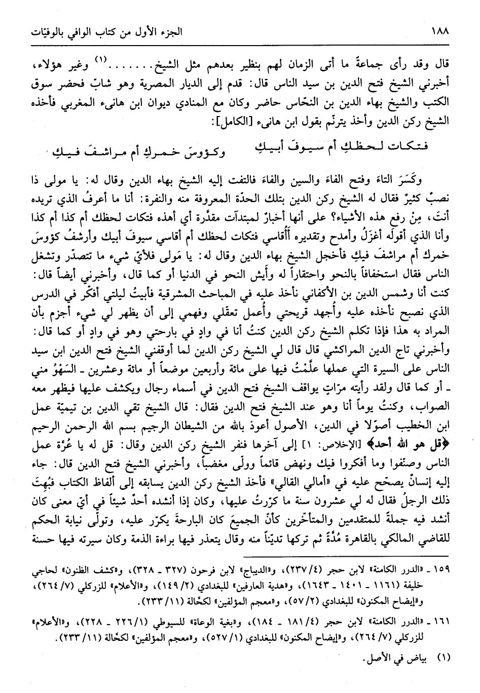 قَالَ وَقد رأى جمَاعَة مَا أَتَى الزَّمَان لَهُم بنظير بعدهمْ مثل الشَّيْخ وَغير هَؤُلَاءِ أَخْبرنِي الشَّيْخ فتح الدّين ابْن سيد النَّاس قَالَ قدم إِلَى الديار المصرية وَهُوَ شَاب فَحَضَرَ سوق الْكتب وَالشَّيْخ بهاء الدّين ابْن النّحاس حَاضر وَكَانَ مَعَ الْمُنَادِي ديوَان ابْن هَانِيء المغربي فَأَخذه الشَّيْخ ركن الدّين وَأخذ يترنم بقول ابْن هَانِئ الْكَامِل