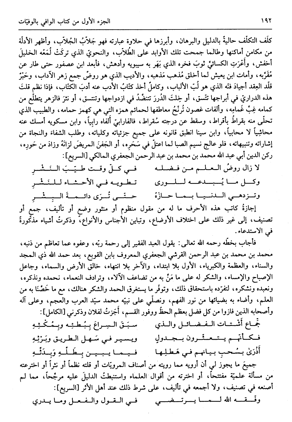 كلف التَّكَلُّف حَالية بِالدَّلِيلِ والبرهان وأبرزها فِي حلاوة عِبَارَته فَهُوَ جلاب الْجلاب وَأظْهر الْأَدِلَّة من مكامن أماكنها وطالما جمحت تِلْكَ الأوابد على الطلاب والنحوي الَّذِي تركت لمعه الْخَلِيل أخفش وأعرت الْكسَائي ثوب فخره الَّذِي بهر بِهِ سِيبَوَيْهٍ وأدهش فأبعد ابْن عُصْفُور حَتَّى طَار عَن مقربه وأمات ابْن يعِيش لما أخلق مَذْهَب مذْهبه والأديب الَّذِي هُوَ روض جمع زهر الْآدَاب وَحبر قلد العقد أجياد فنه الَّذِي هُوَ لب الْأَلْبَاب وكامل أَخذ كتاب الْأَدَب عَنهُ أدب الْكتاب فَإِذا نظم قلت هَذِه الدراري فِي إبراجها تتسق أَو خلت الدُّرَر تتنضد فِي أزدواجها وتنتسق أَو نثر فالزهر يتطلع من كمامه غب غمامه والفات غصون ترنح معاطفها لحمائم همزَة الَّتِي هِيَ كهمز حمامه والطبيب الَّذِي تحلى مِنْهُ بقراط بأقراط وَسقط عَن دَرَجَته سقراط فالفارابي ألفاه رابياً وَابْن مسكويه امسك عَنهُ محاشياً لَا محابياً وَابْن سينا انطبق قانونه على جَمِيع جزئياته وكلياته وَطلب الشِّفَاء والنجاة من إشاراته وتنبيهاته فَلَو عالج نسيم الصِّبَا لما اعتل فِي سحره أَو الجفن الْمَرِيض لزانه وَزَاد من حوره ركن الدّين أبي عبد الله مُحَمَّد بن مُحَمَّد بن عبد الرَّحْمَن الْجَعْفَرِي الْمَالِكِي السَّرِيع