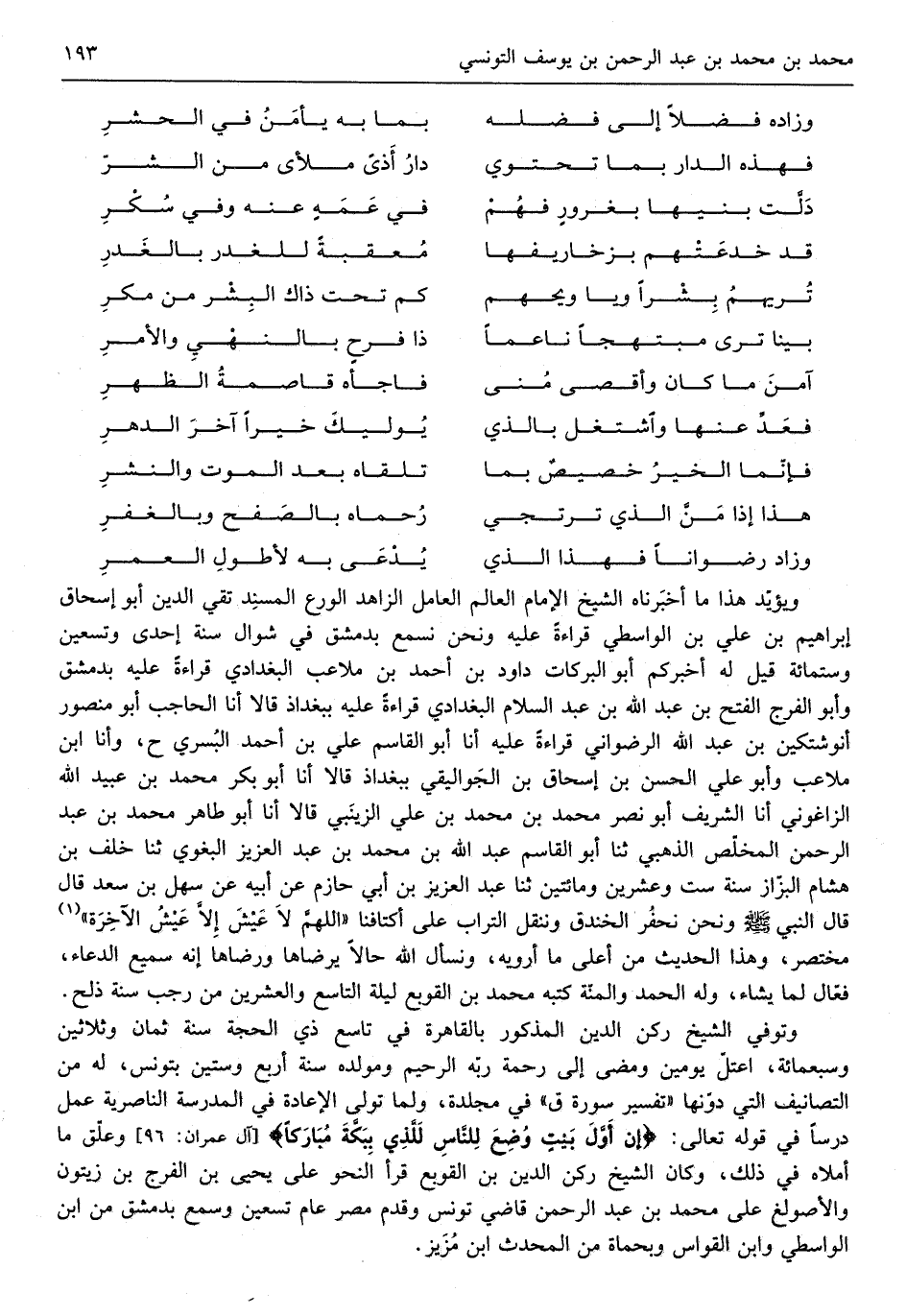 وَيُؤَيّد هَذَا مَا أخبرناه الشَّيْخ الإِمَام الْعَالم الْعَامِل الزَّاهِد الْوَرع الْمسند تَقِيّ الدّين أَبُو اسحاق ابراهيم بن عَليّ ابْن الوَاسِطِيّ قِرَاءَة عَلَيْهِ وَنحن نسْمع بِدِمَشْق فِي شَوَّال سنة إِحْدَى وَتِسْعين وست مائَة قيل لَهُ أخْبركُم أَبُو البركات دَاوُد بن أَحْمد بن ملاعب الْبَغْدَادِيّ قِرَاءَة عَلَيْهِ بِدِمَشْق وَأَبُو الْفرج الْفَتْح بن عبد الله بن عبد السَّلَام الْبَغْدَادِيّ قِرَاءَة عَلَيْهِ بِبَغْدَاد قَالَا أَنا الْحَاجِب أَبُو مَنْصُور أنوشتكين بن عبد الله الرضواني قِرَاءَة عَلَيْهِ أَنا أَبُو الْقَاسِم عَليّ بن أَحْمد البسري ح وَأَنا ابْن ملاعب وَأَبُو عَليّ الْحسن بن إِسْحَاق ابْن الجواليقي بِبَغْدَاد قَالَا أَنا أَبُو بكر مُحَمَّد بن عبيد الله الزَّاغُونِيّ أَنا الشريف أَبُو نصرٍ مُحَمَّد بن مُحَمَّد بن عَليّ الزَّيْنَبِي قَالَا أَنا أَبُو طَاهِر مُحَمَّد بن عبد الرَّحْمَن المخلص الذَّهَبِيّ ثَنَا أَبُو الْقَاسِم عبد الله بن مُحَمَّد بن عبد الْعَزِيز الْبَغَوِيّ ثَنَا خلف بن هِشَام الْبَزَّاز سنة سِتّ وَعشْرين وَمِائَتَيْنِ ثَنَا عبد الْعَزِيز بن أبي حَازِم عَن أَبِيه عَن سهل بن سعد قَالَ قَالَ النَّبِي صلى الله عَلَيْهِ وَسلم وَنحن نحفر الخَنْدَق وننقل التُّرَاب على أكتافنا اللَّهُمَّ لَا عَيْش إِلَّا عَيْش الْآخِرَة مُخْتَصر وَهَذَا الحَدِيث من أَعلَى مَا أرويه ونسأل الله حَالا يرضاها ورضاها أَنه سميع الدُّعَاء فعال لما يَشَاء وَله الْحَمد والْمنَّة كتبه مُحَمَّد بن القوبع لَيْلَة التَّاسِع وَالْعِشْرين من رَجَب سنة ذلح