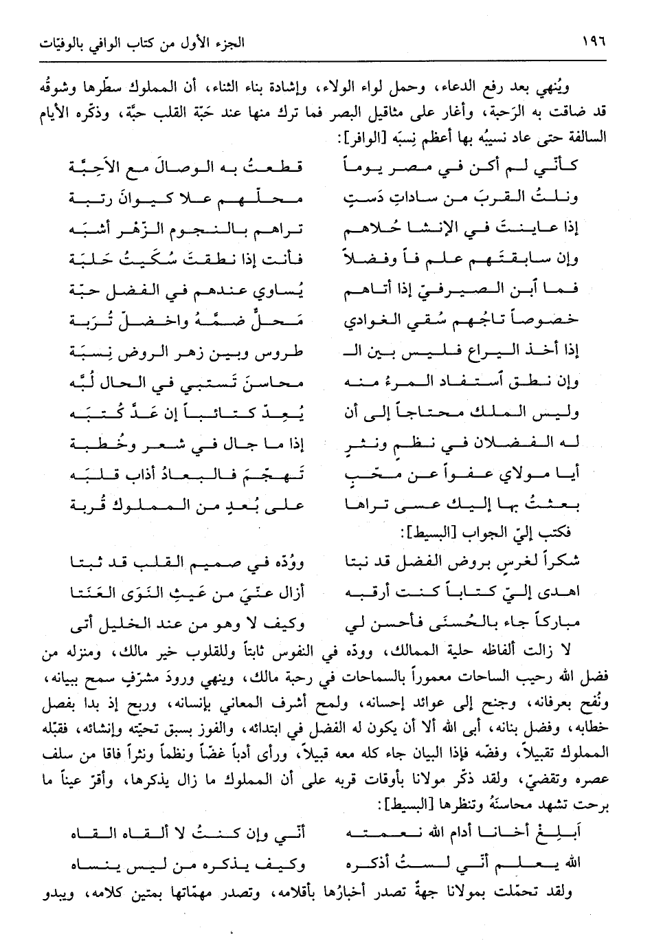 لَا زَالَت أَلْفَاظه حلية المماليك ووده فِي النُّفُوس ثَابتا وللقلوب خير مَالك ومنزله من فضل الله رحيب الساحات معمورا بالسماحات فِي رحبة مَالك وَينْهى وُرُود مشرف سمح ببيانه ونفح بعرفانه وجنح إِلَى عوائد إحسانه ولمح أشرف الْمعَانِي بإنسانه وَربح إِذْ بدا بفصل خطابه وَفضل بنانه أَبى الله إِلَّا أَن يكون لَهُ الْفضل فِي ابْتِدَائه والفوز بسبق تحيته وانشائه فَقبله الْمَمْلُوك تقبيلاً وفضه فَإِذا الْبَيَان جَاءَ كُله مَعَه قبيلا وَرَأى أدباً غضاً ونظماً ونثراً فاقاً من سلف عصره وتقضي وَلَقَد ذكر مَوْلَانَا بأوقات قربه على أَن الْمَمْلُوك مَا زَالَ يذكرهَا وَأقر عينا مَا بَرحت تشهد محاسنه وتنظرها الْبَسِيط