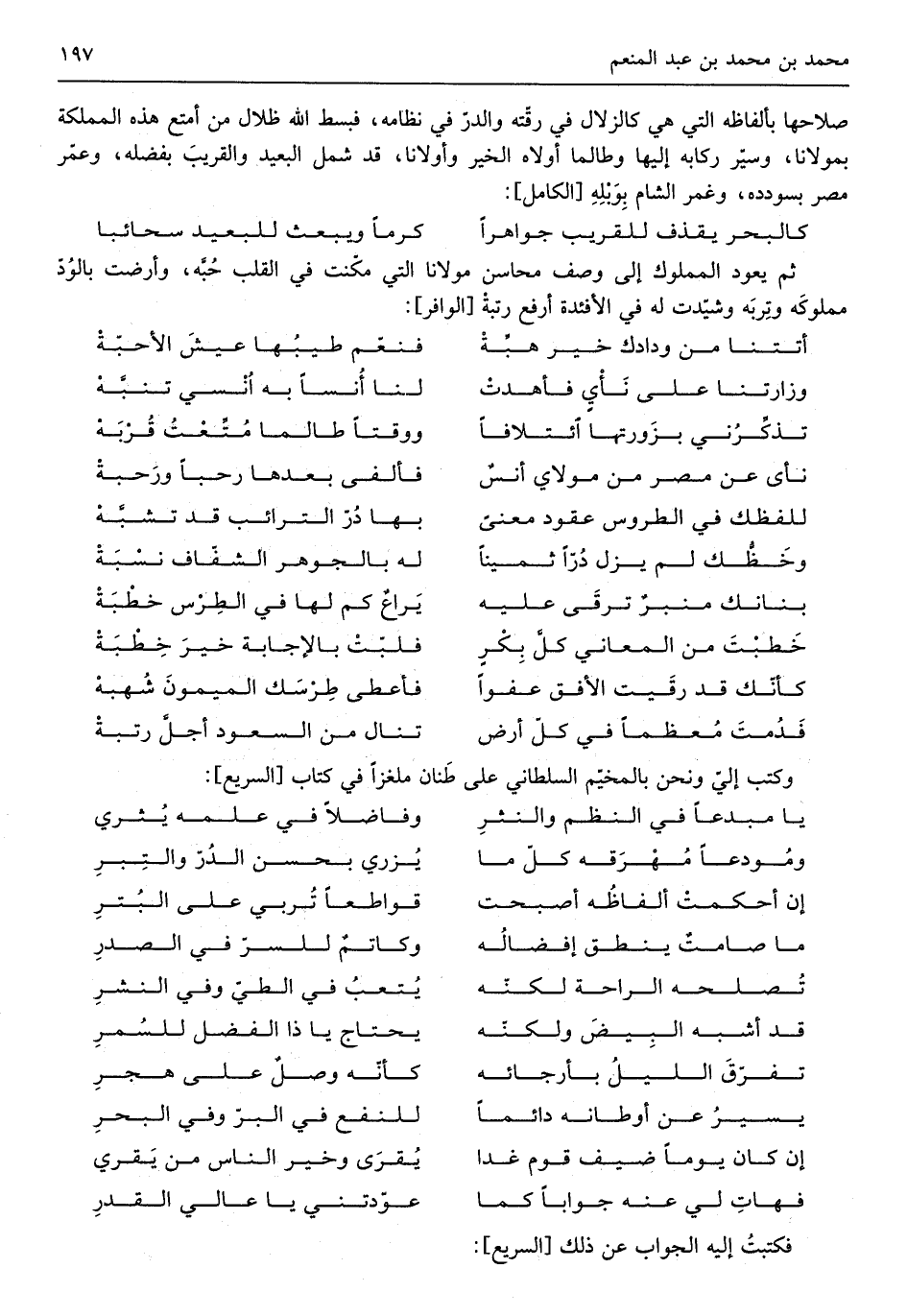 ثمَّ يعود الْمَمْلُوك إِلَى وصف محَاسِن مَوْلَانَا الَّتِي مكنت فِي الْقلب حبه وأرضت بالود مَمْلُوكه وتربه وشيدت لَهُ فِي الأفئدة أرفع رُتْبَة الوافر